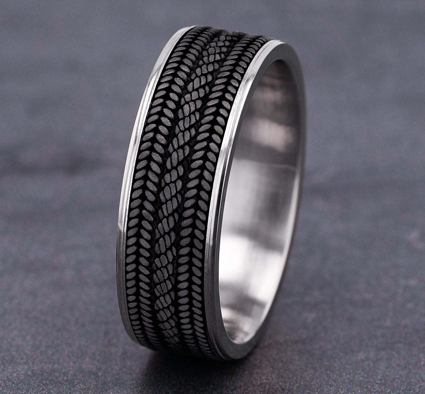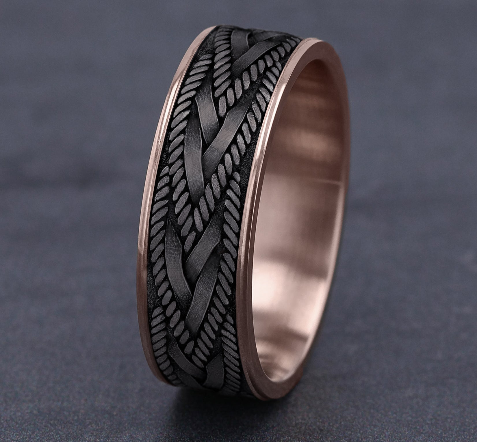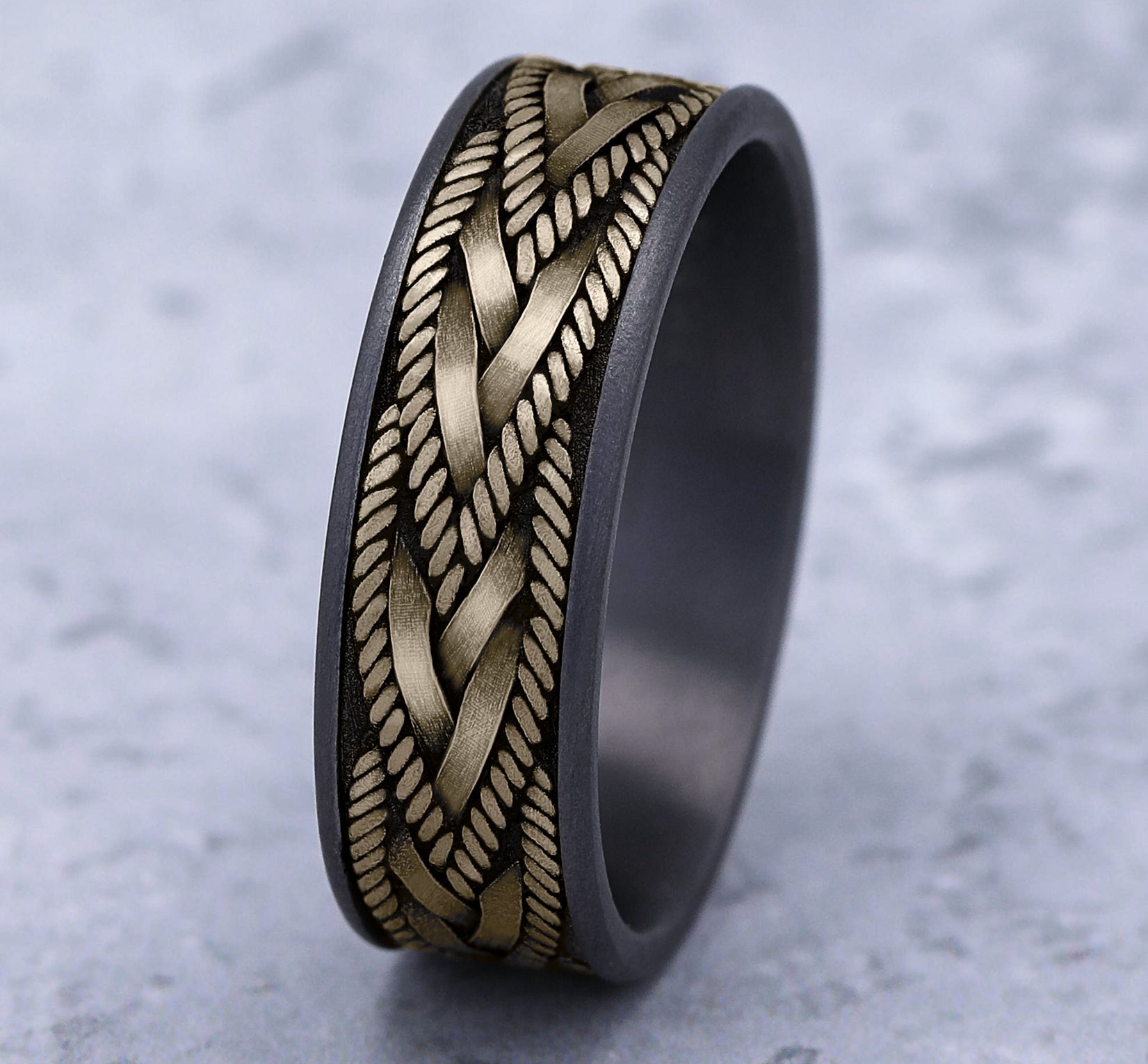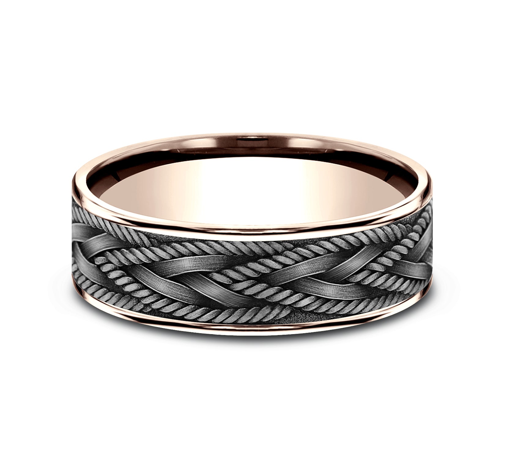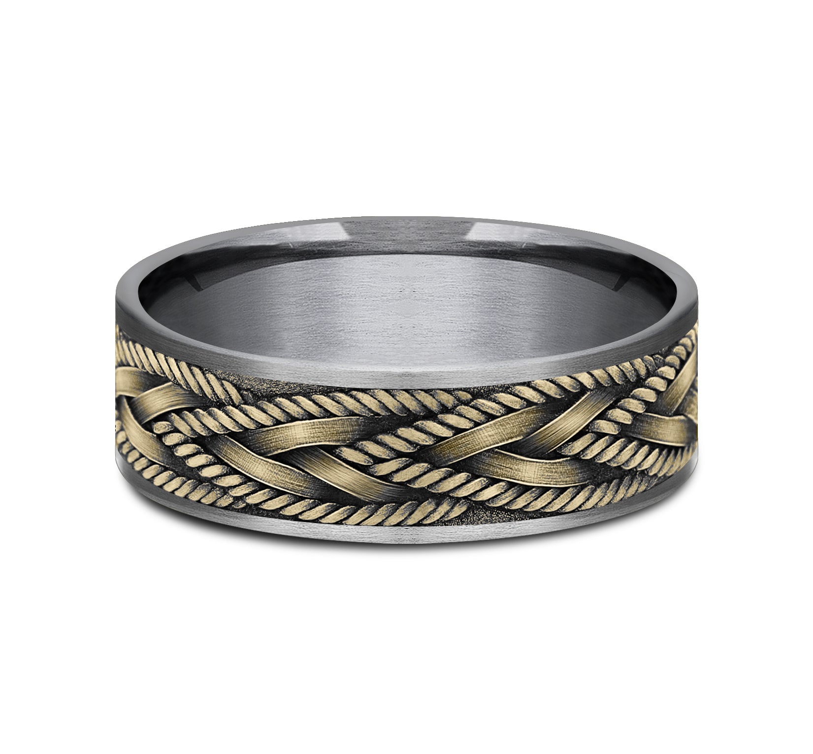 7.5mm, Comfort fit Grey Tantalum and 14K Yellow Gold Rope and wheat knot braid pattern, thin edges