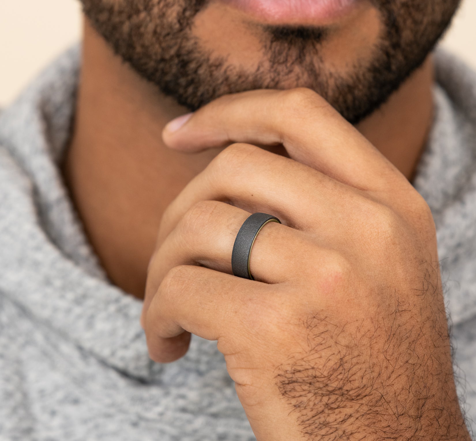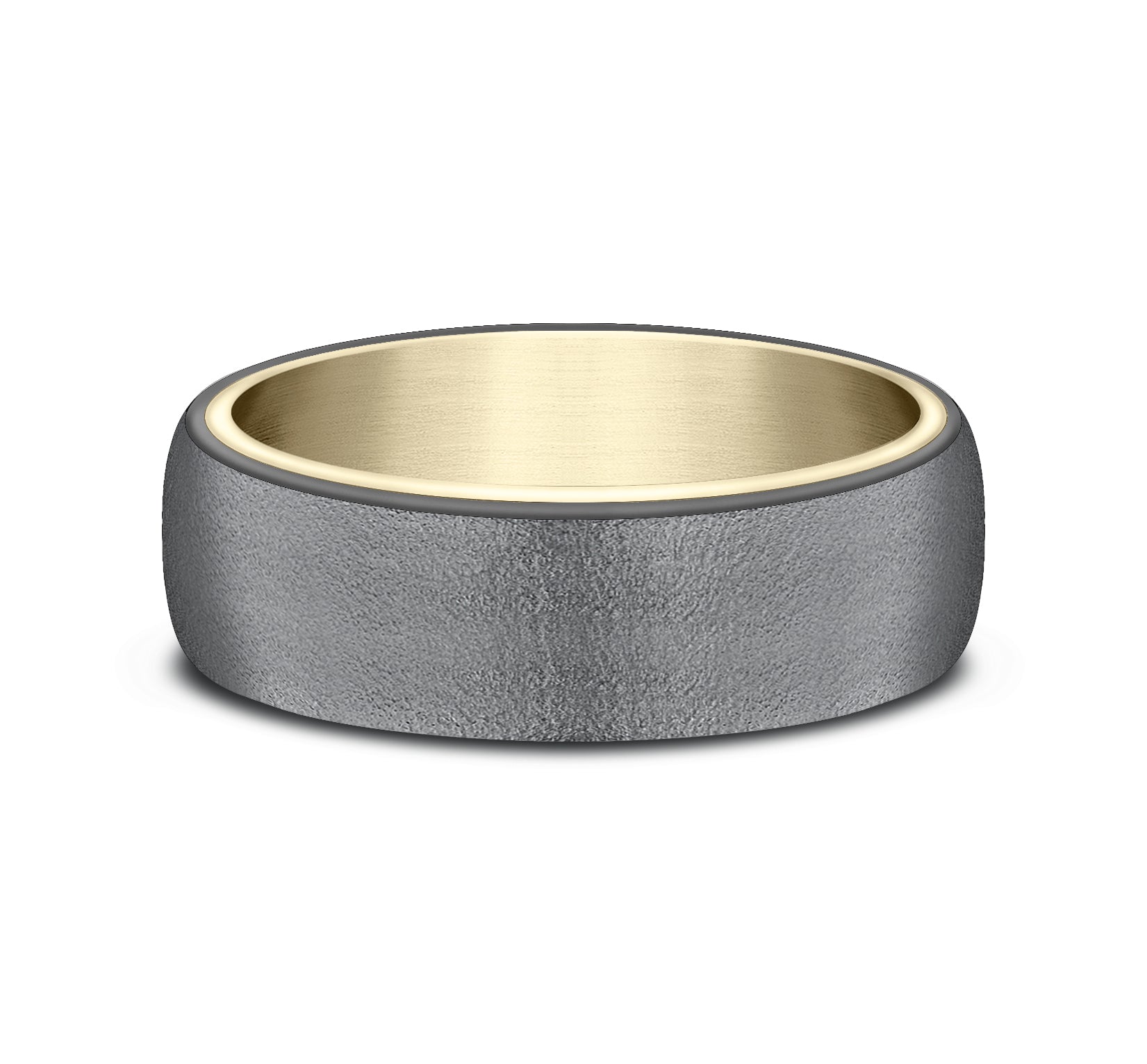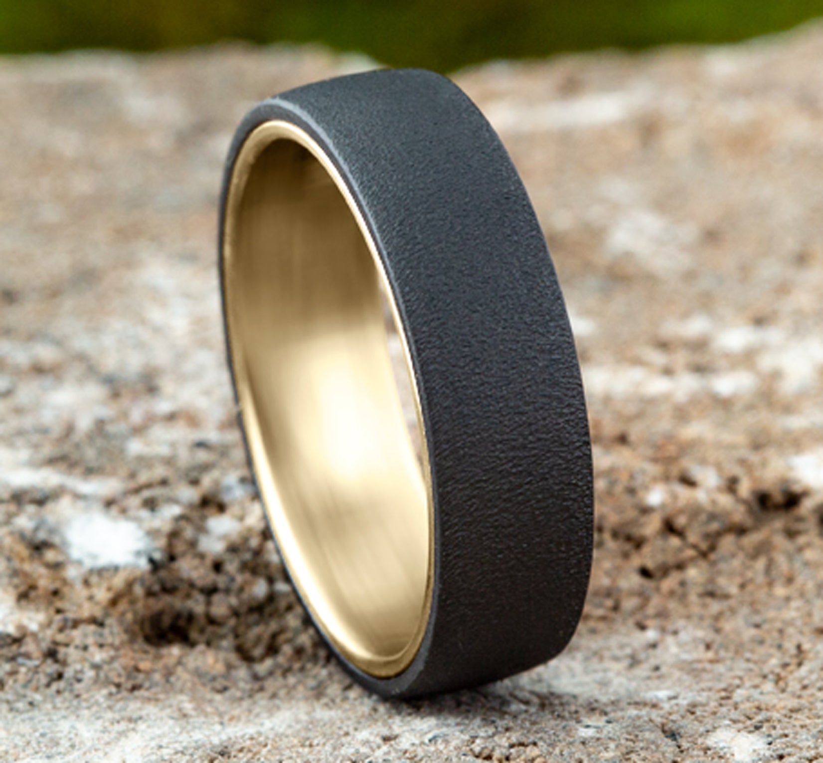 7mm, Comfort fit 14K Rose Gold and Darkened Tantlaum Wire brush finish, one satin edge