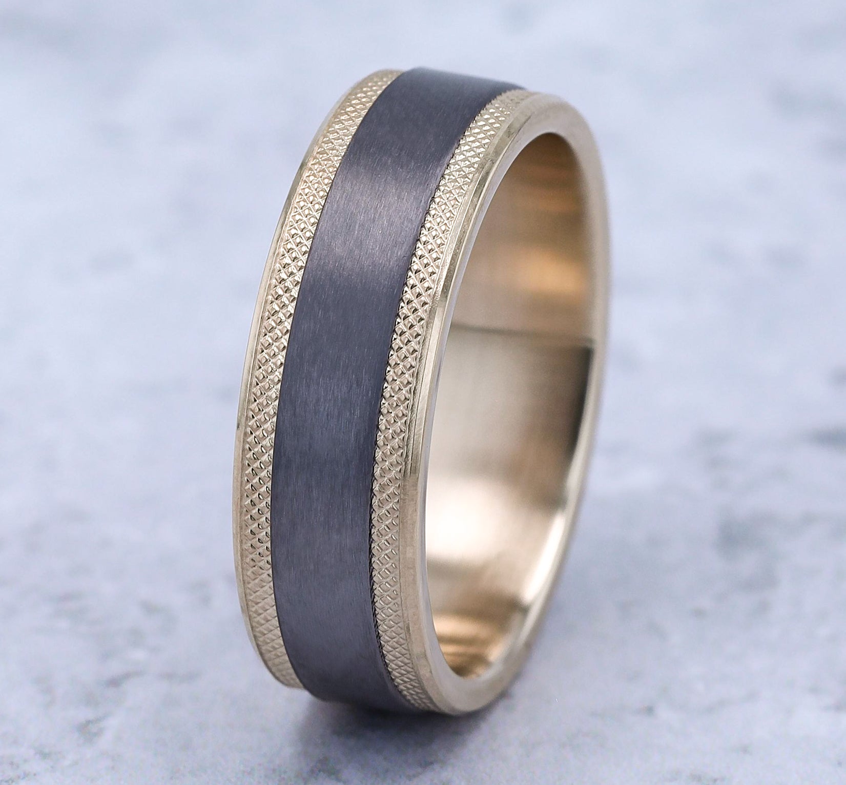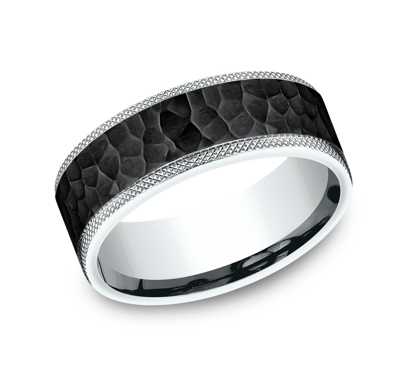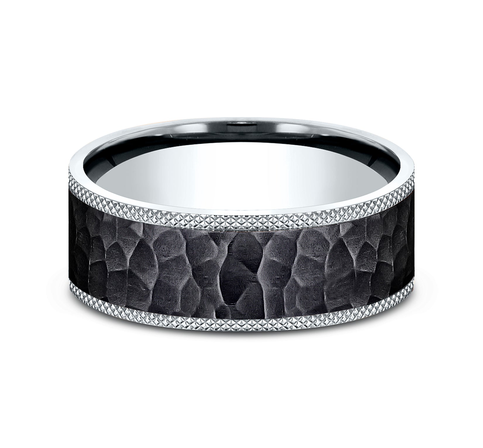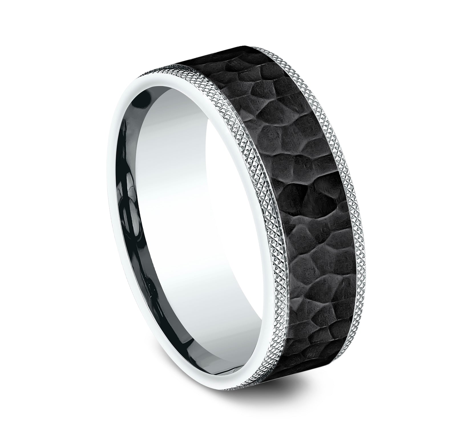 8mm, Comfort fit 14K White Gold and Black Titanium Hammered center, knurl detailed edges