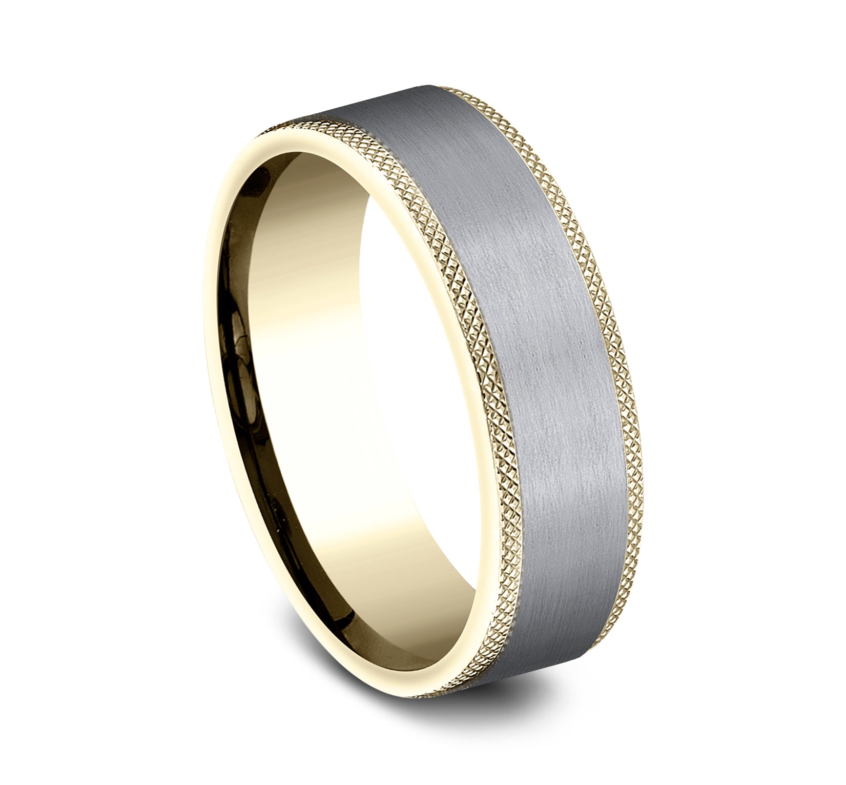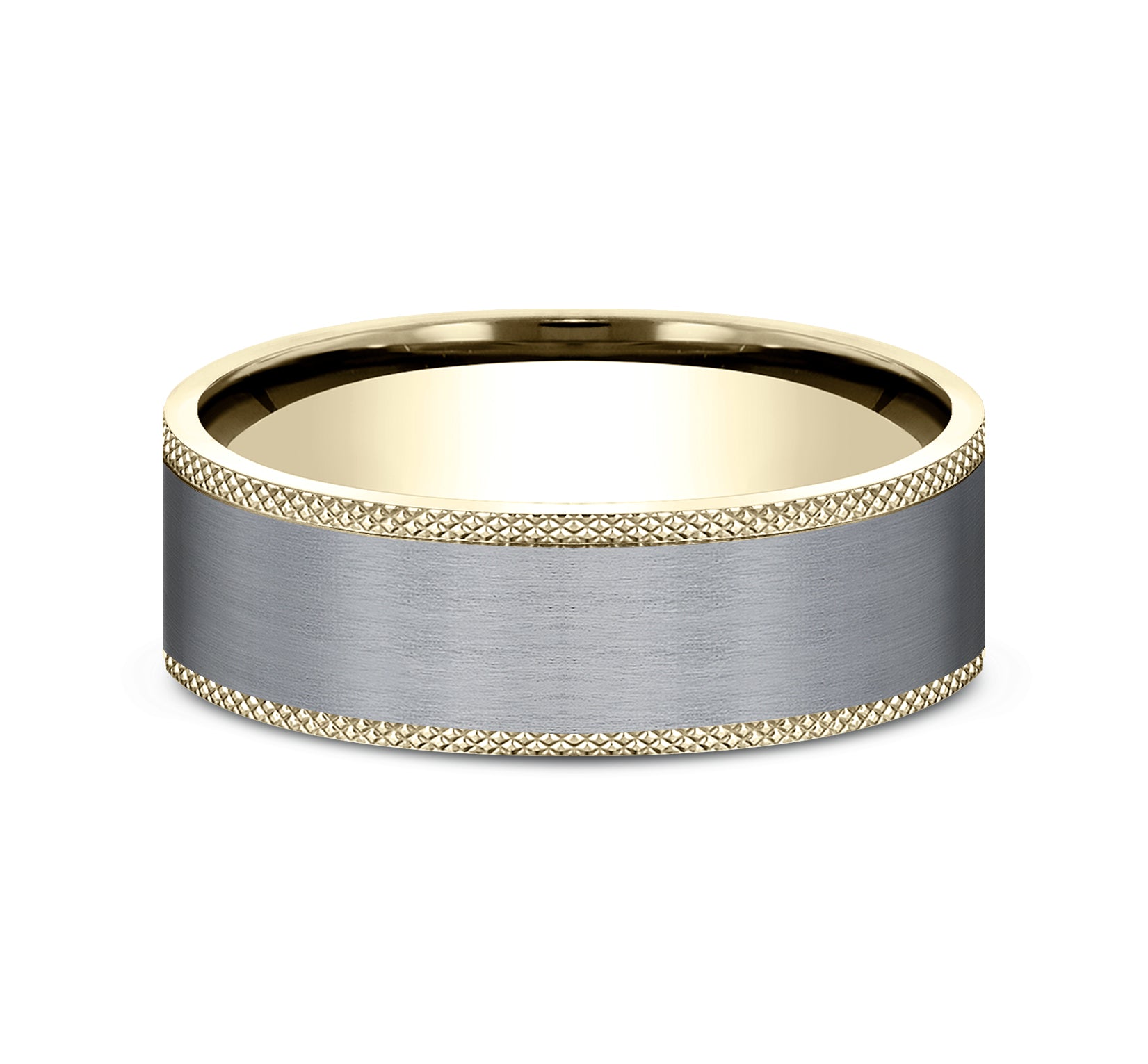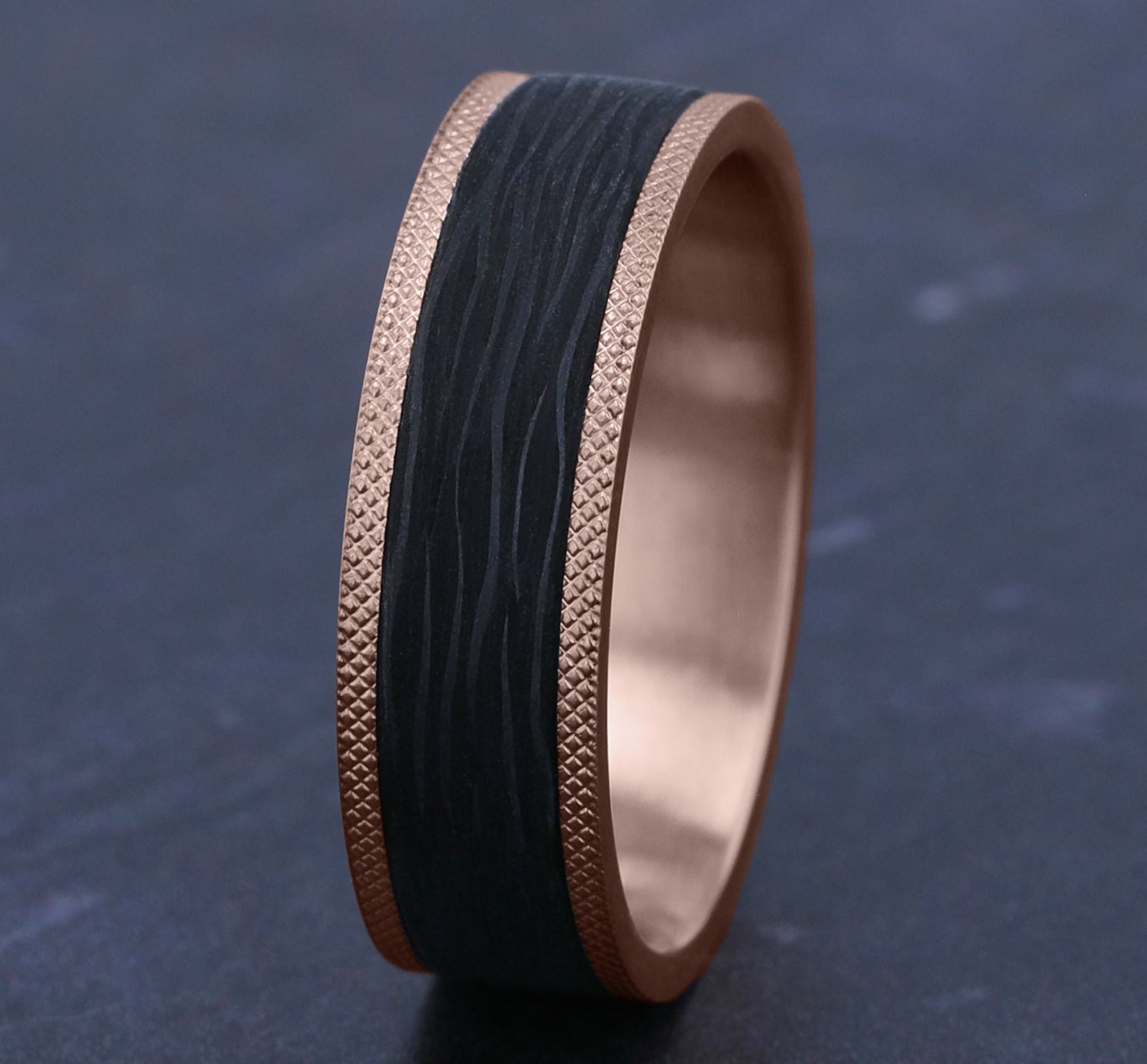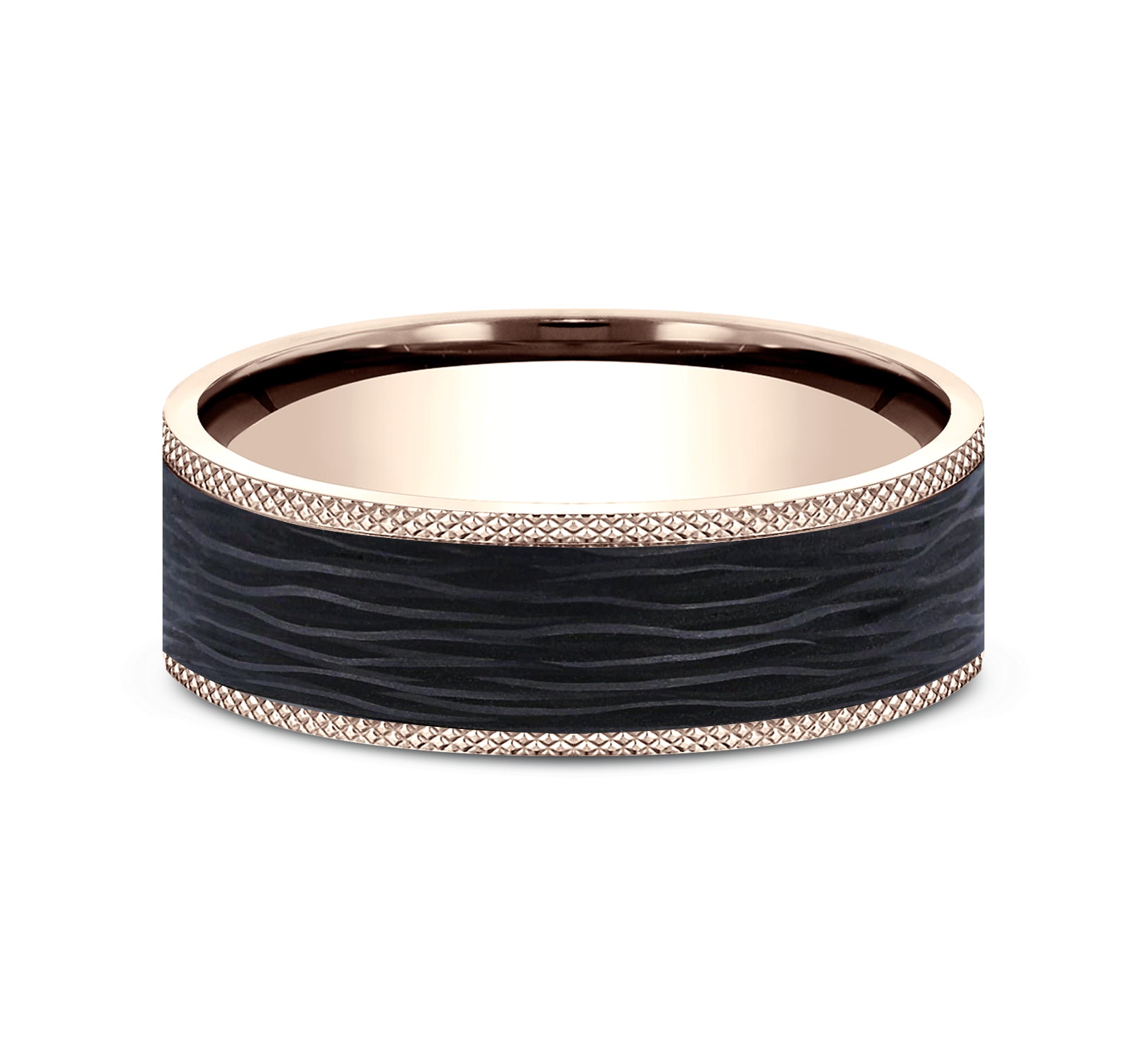 8mm, Comfort fit 14K White Gold and Black Titanium Hammered center, knurl detailed edges
