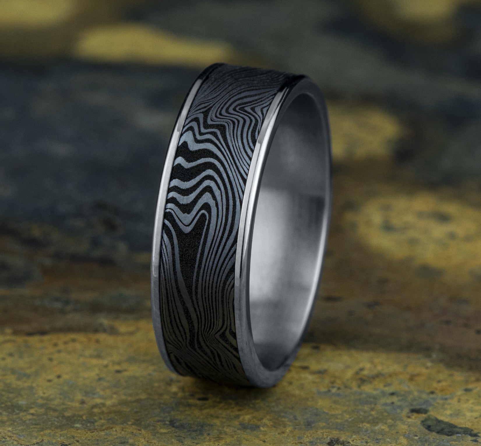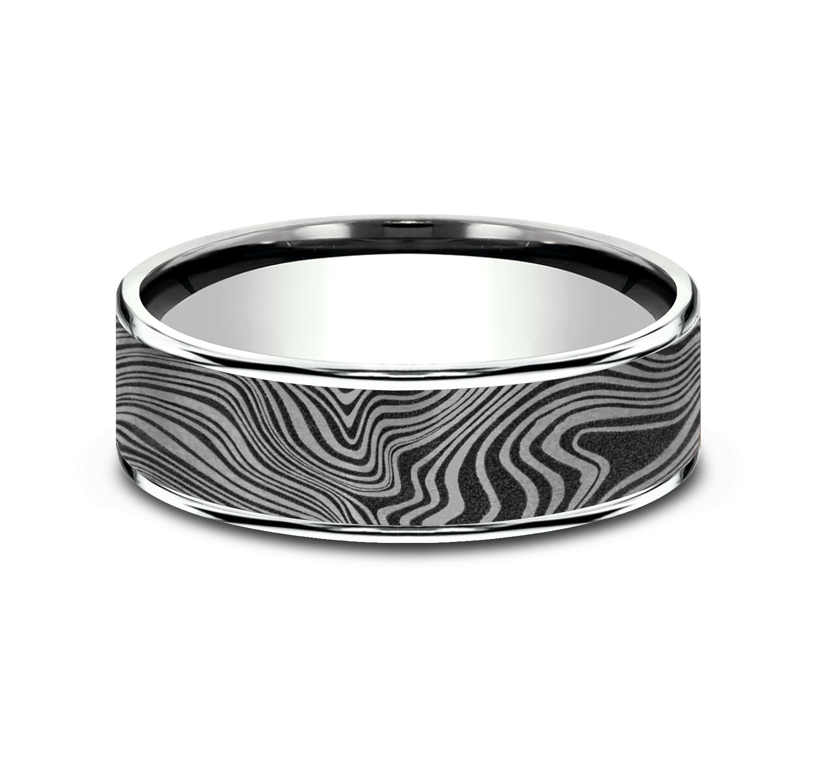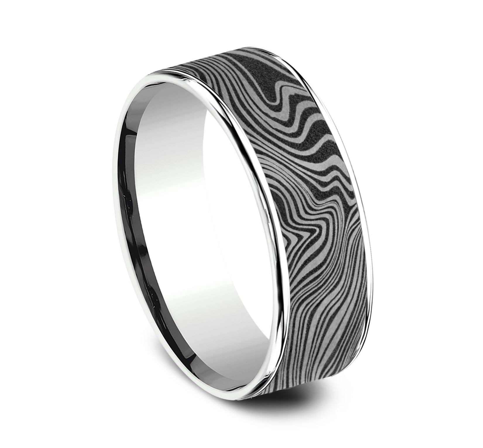 7.5mm, Comfort fit 14K White Gold and Grey Tantalum Unique Tamascus designed center, thin edges