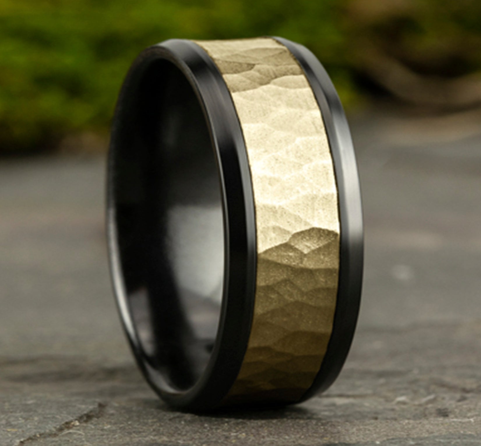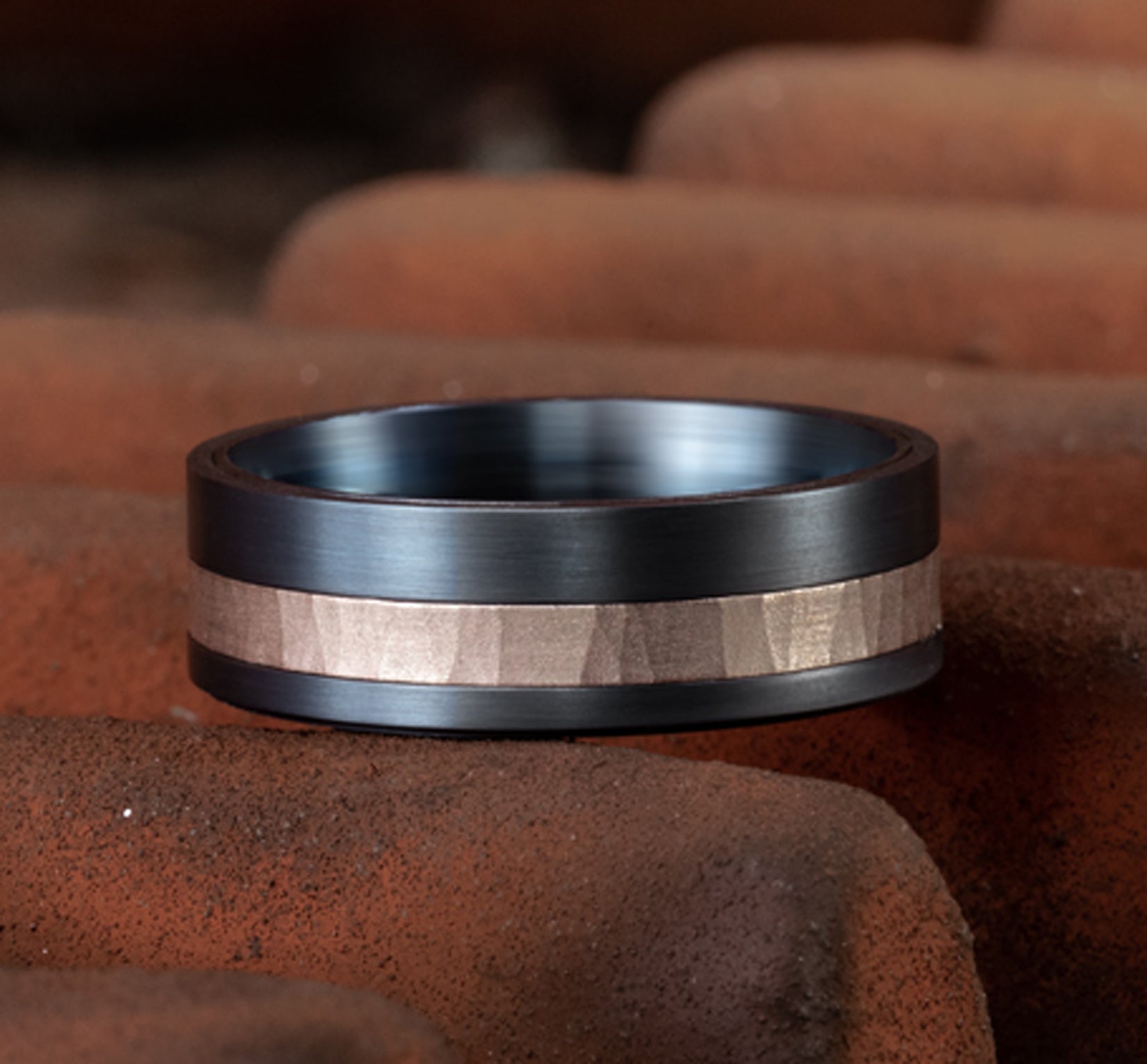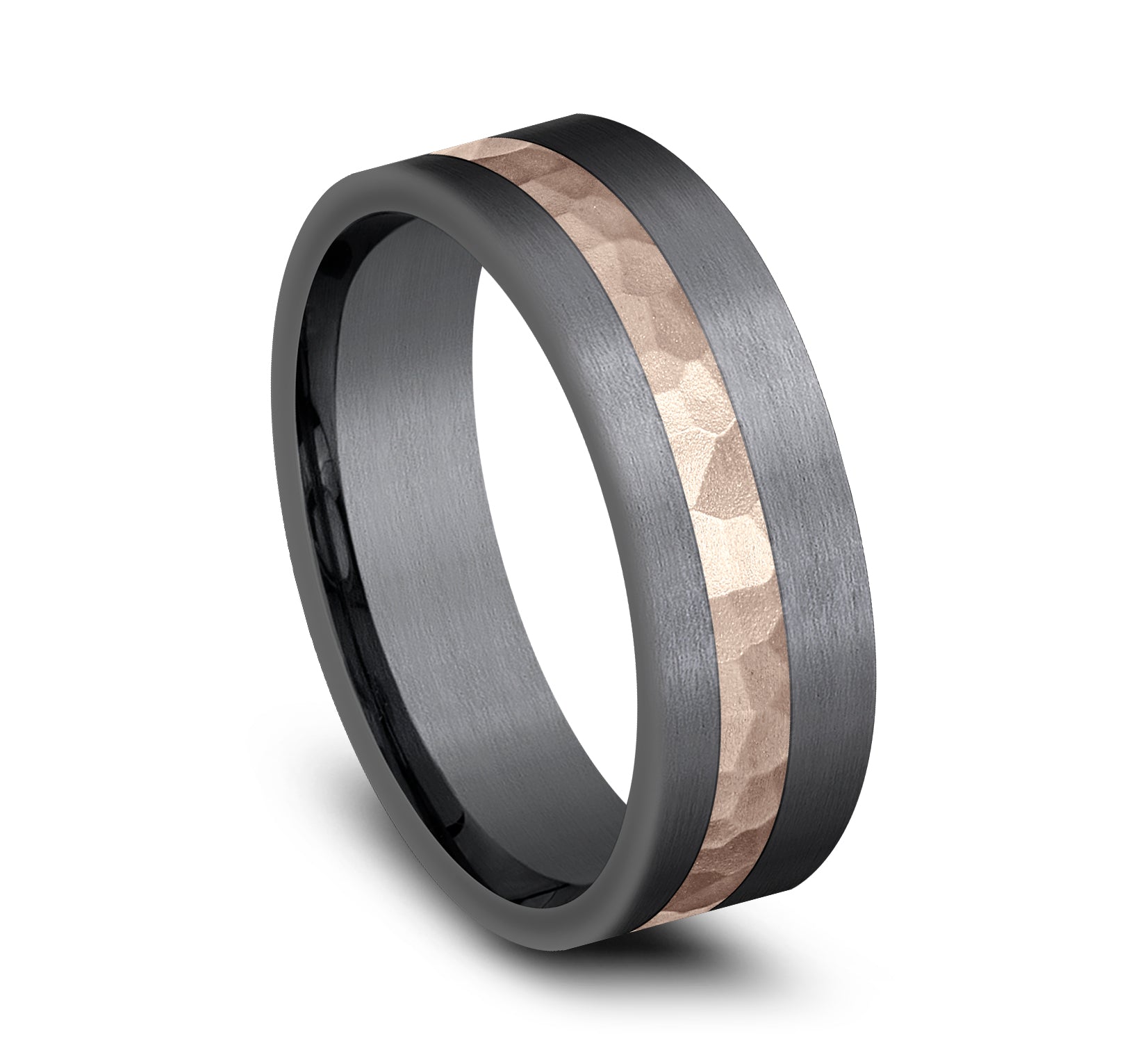 6.5mm, Comfort fit 14K White Gold and Darkened Tantalum Hammered center, polished thin edges