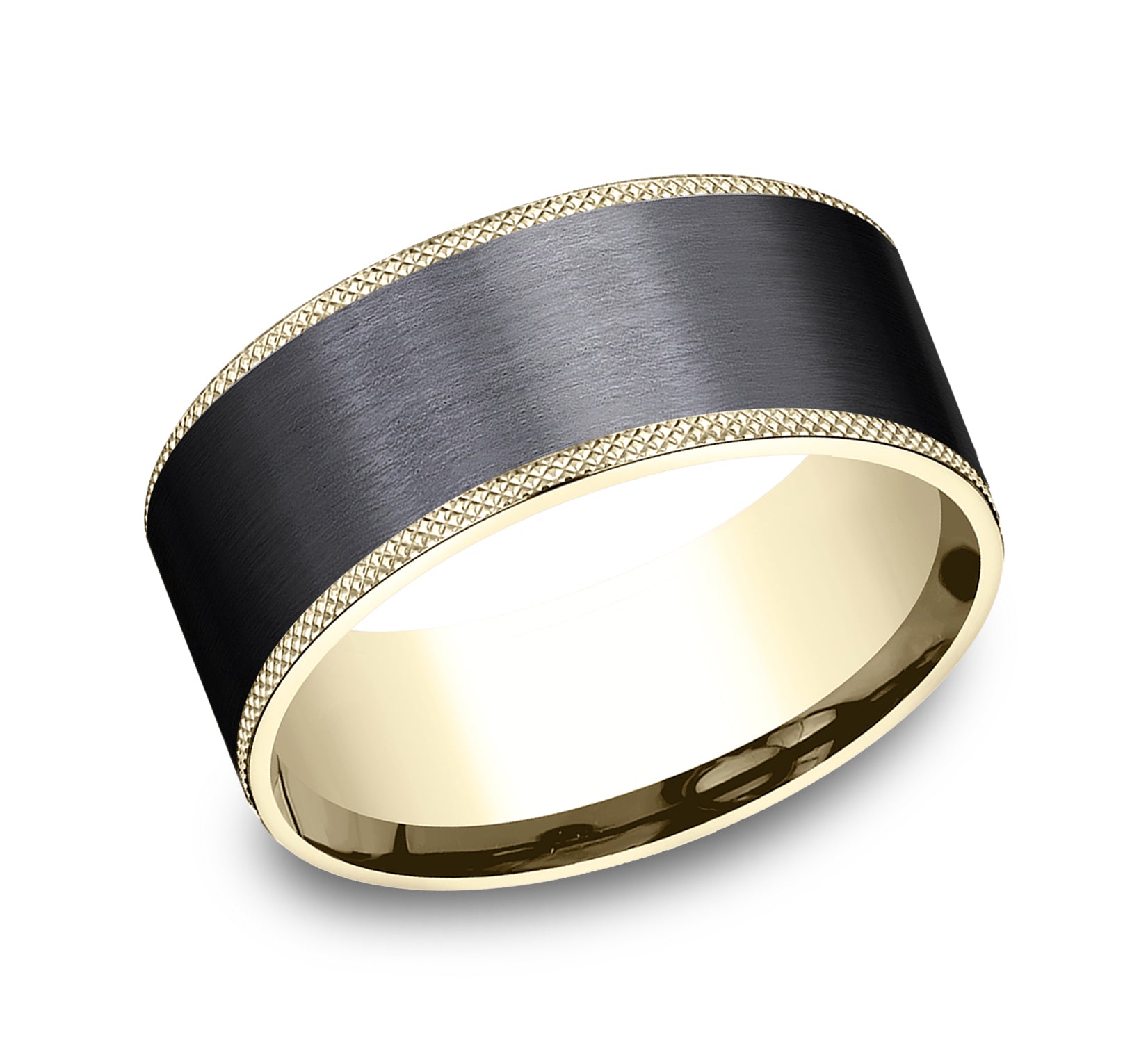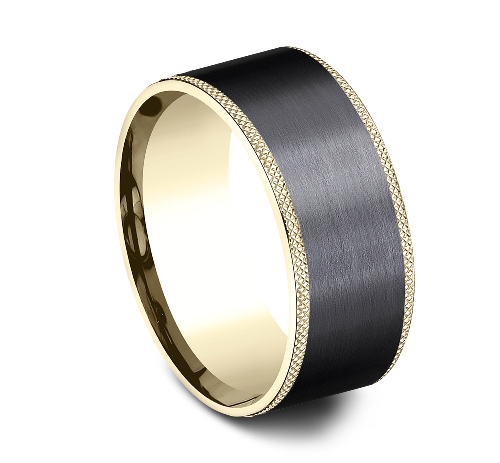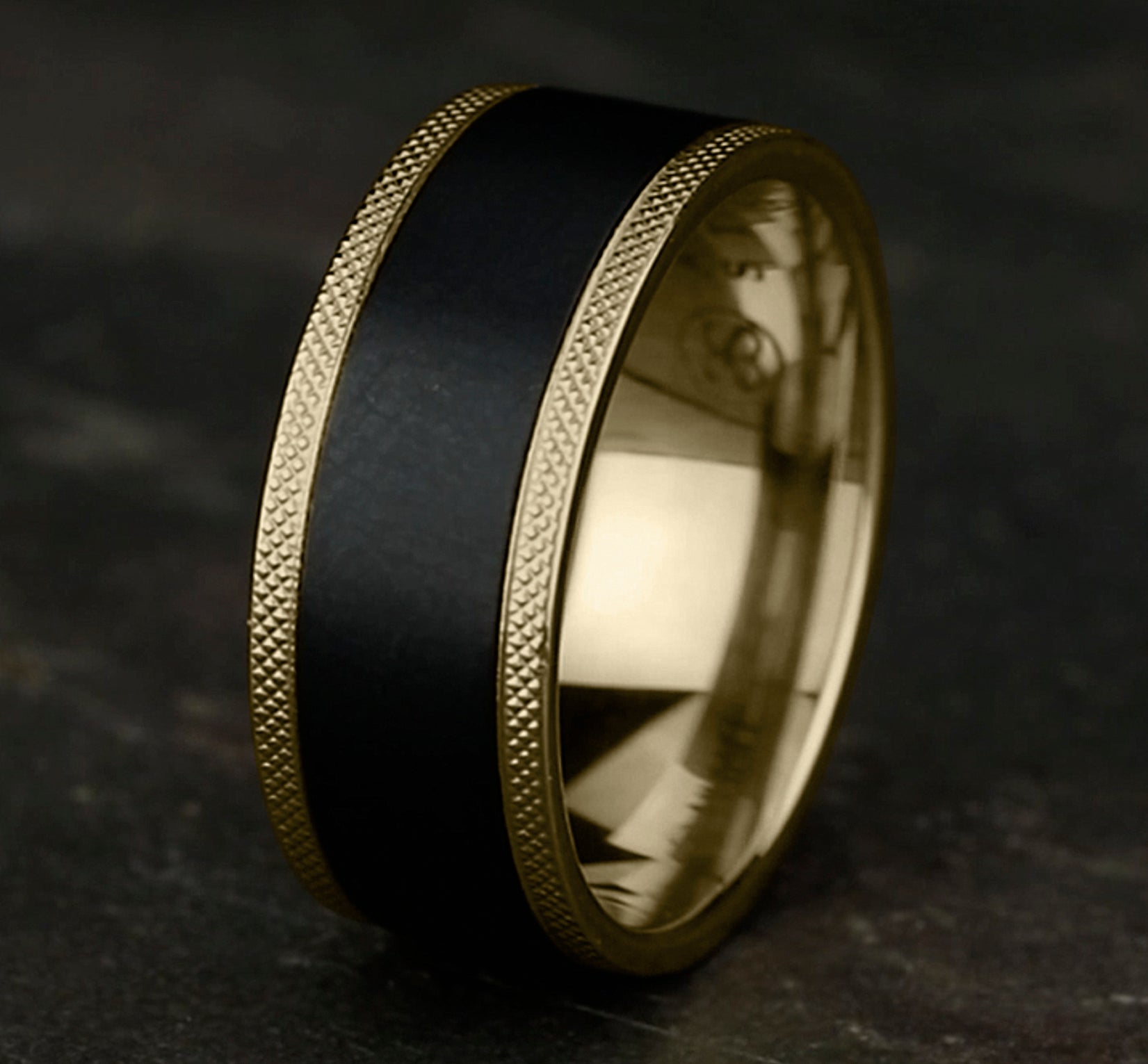 7mm, Comfort fit 14K Rose Gold and Forged Carbon Fiber Forged carbon fiber center, knurled edges
