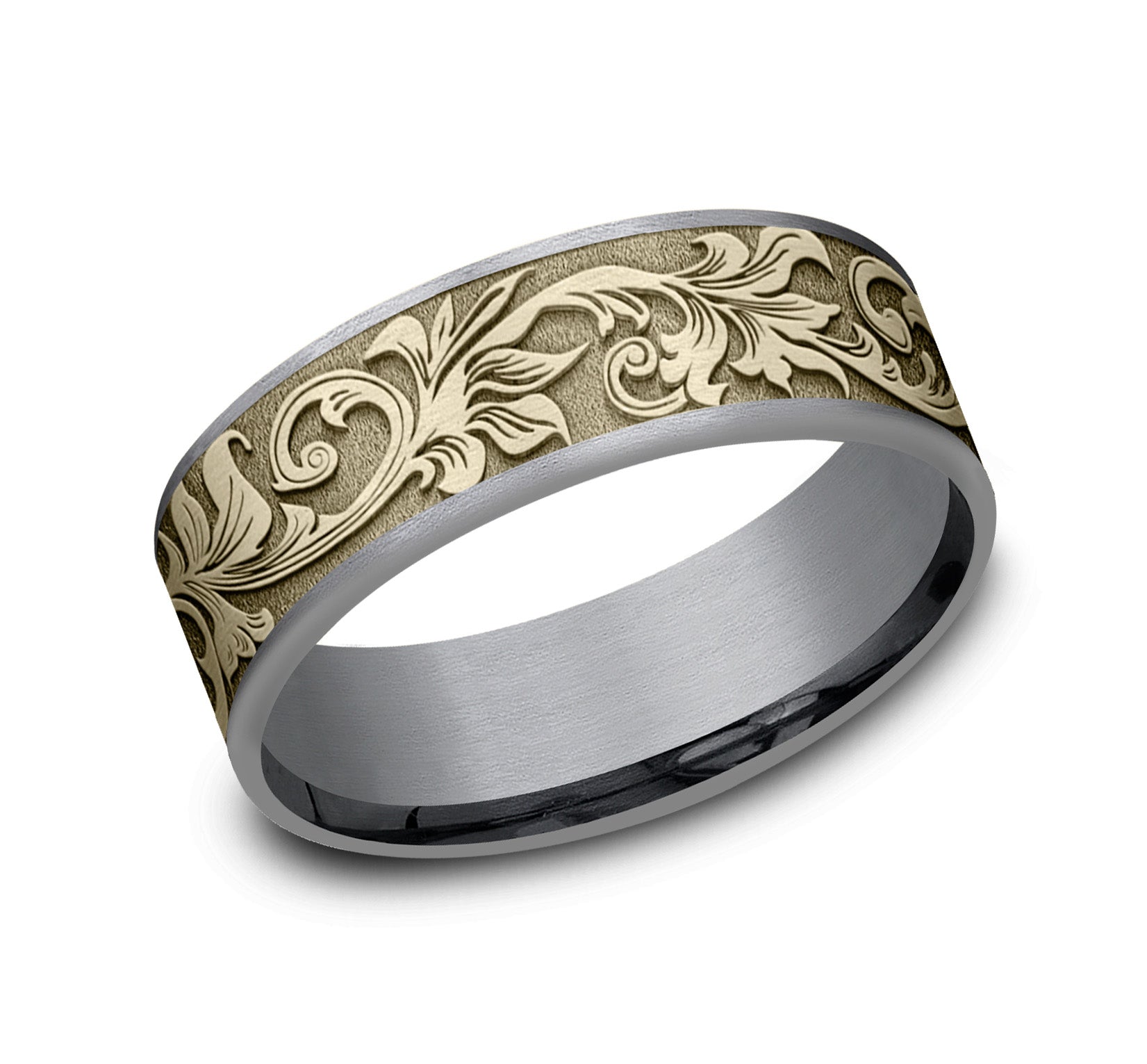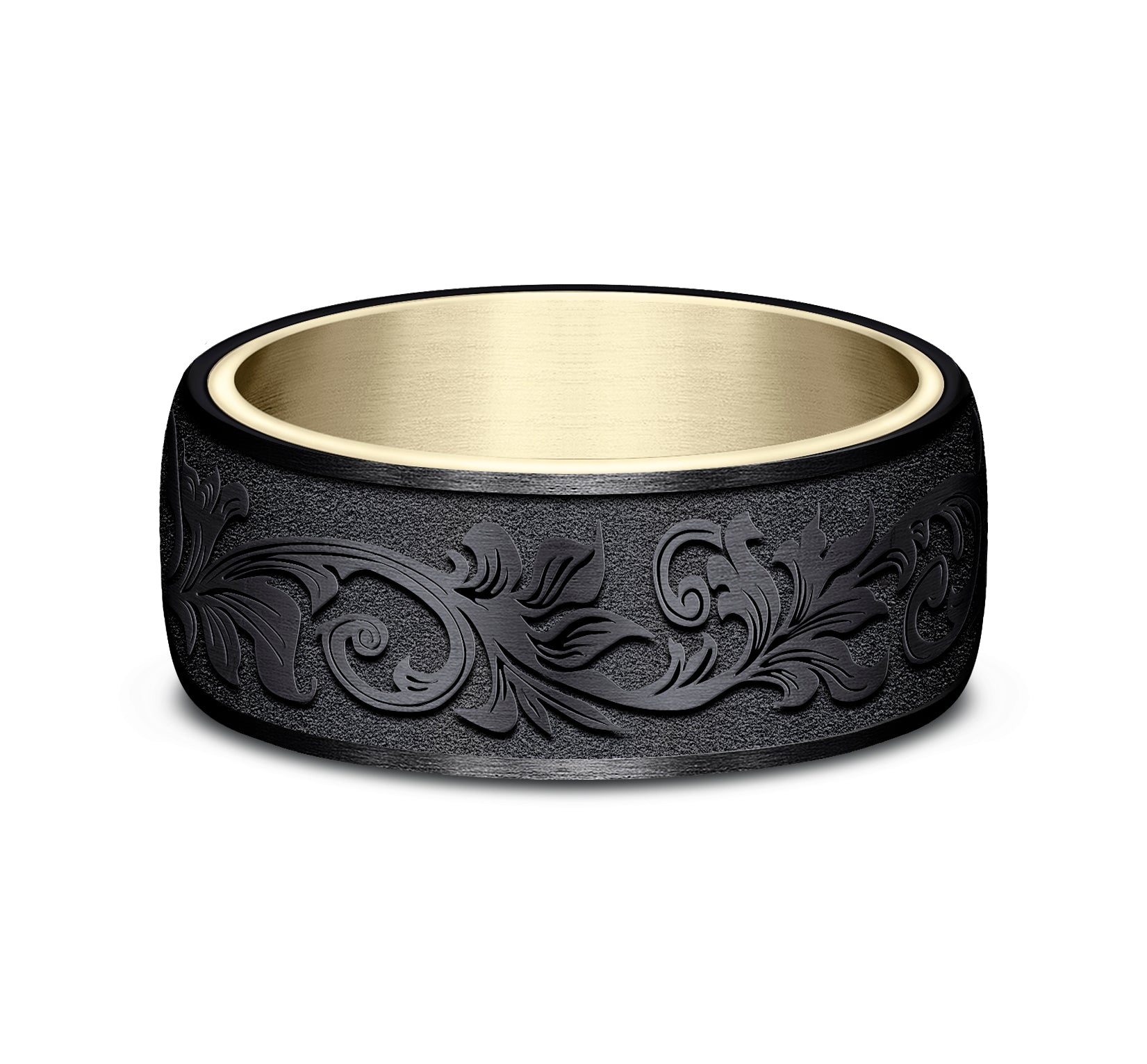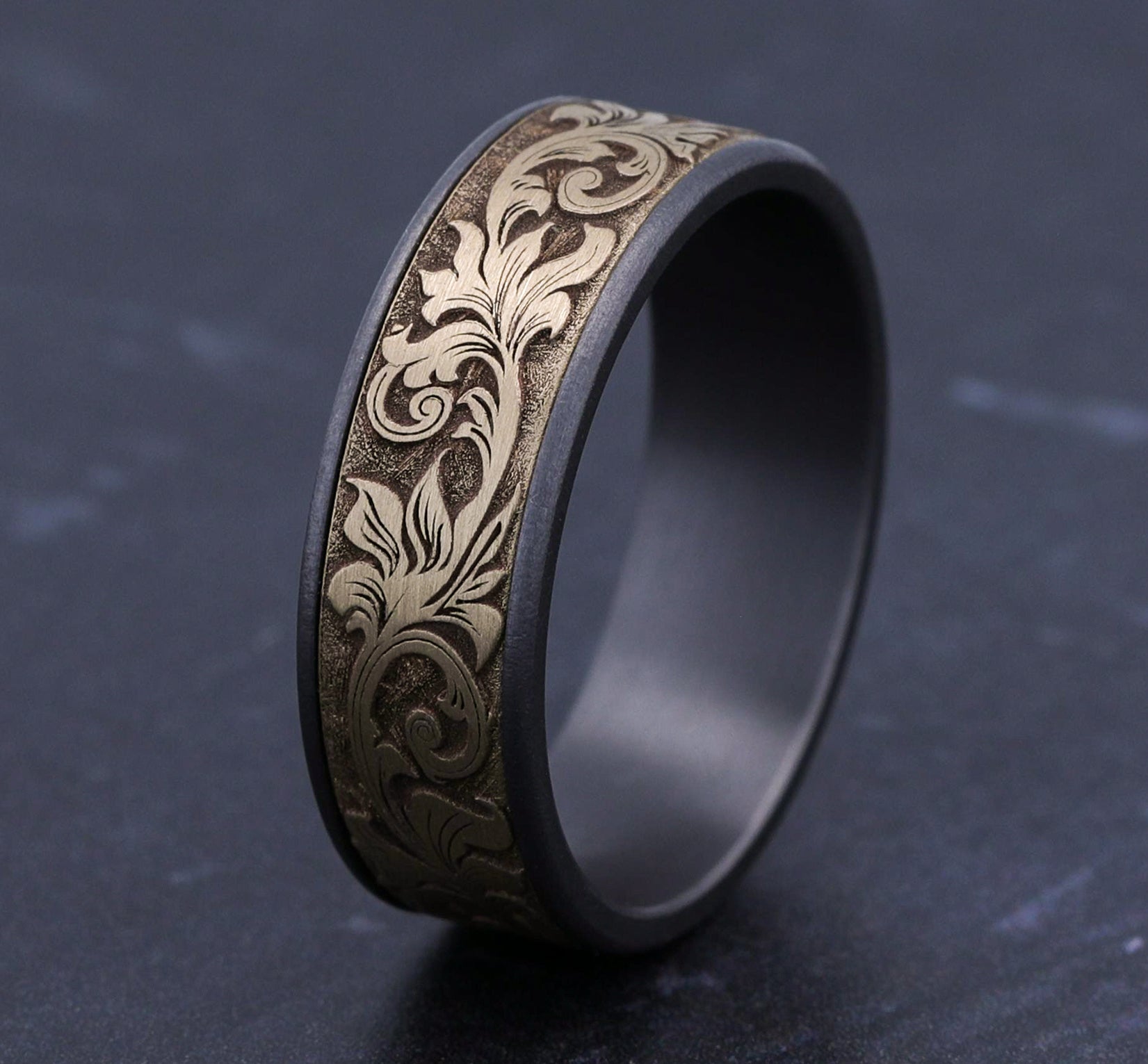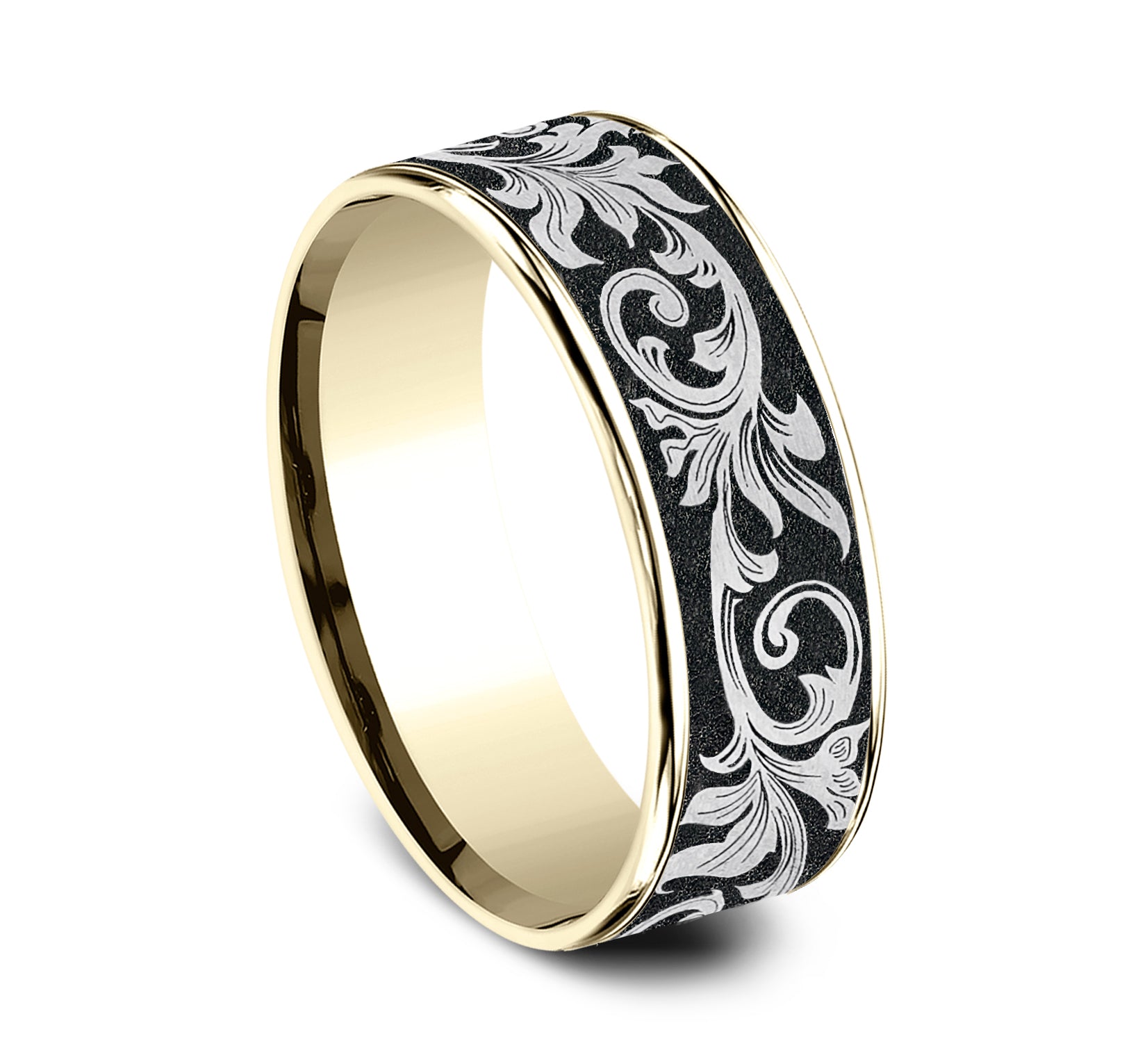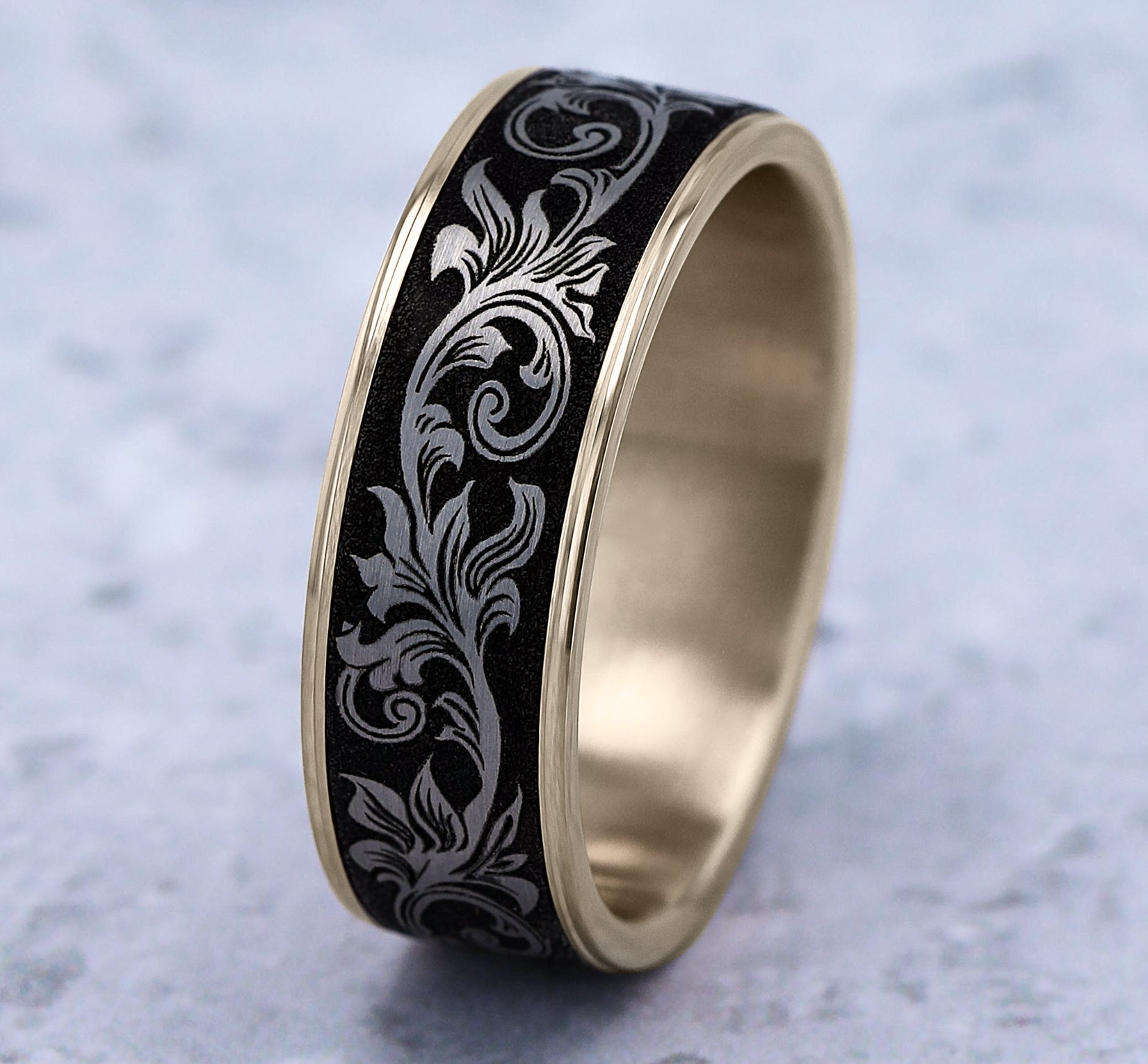 7.5mm, Comfort fit 14K Yellow Gold and Grey/Black Titanium Vintage script pattern, thin edges