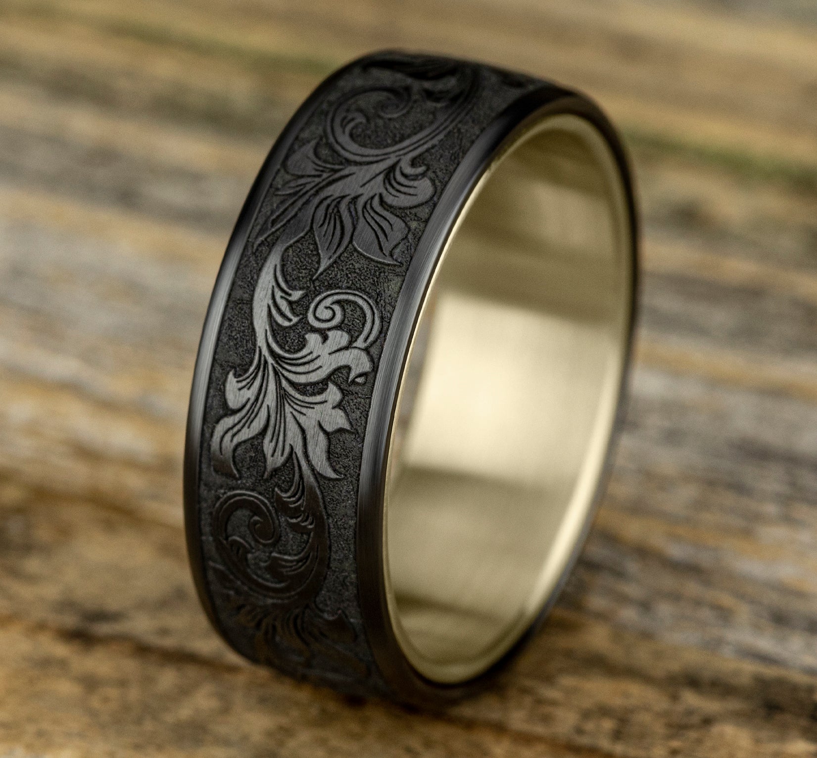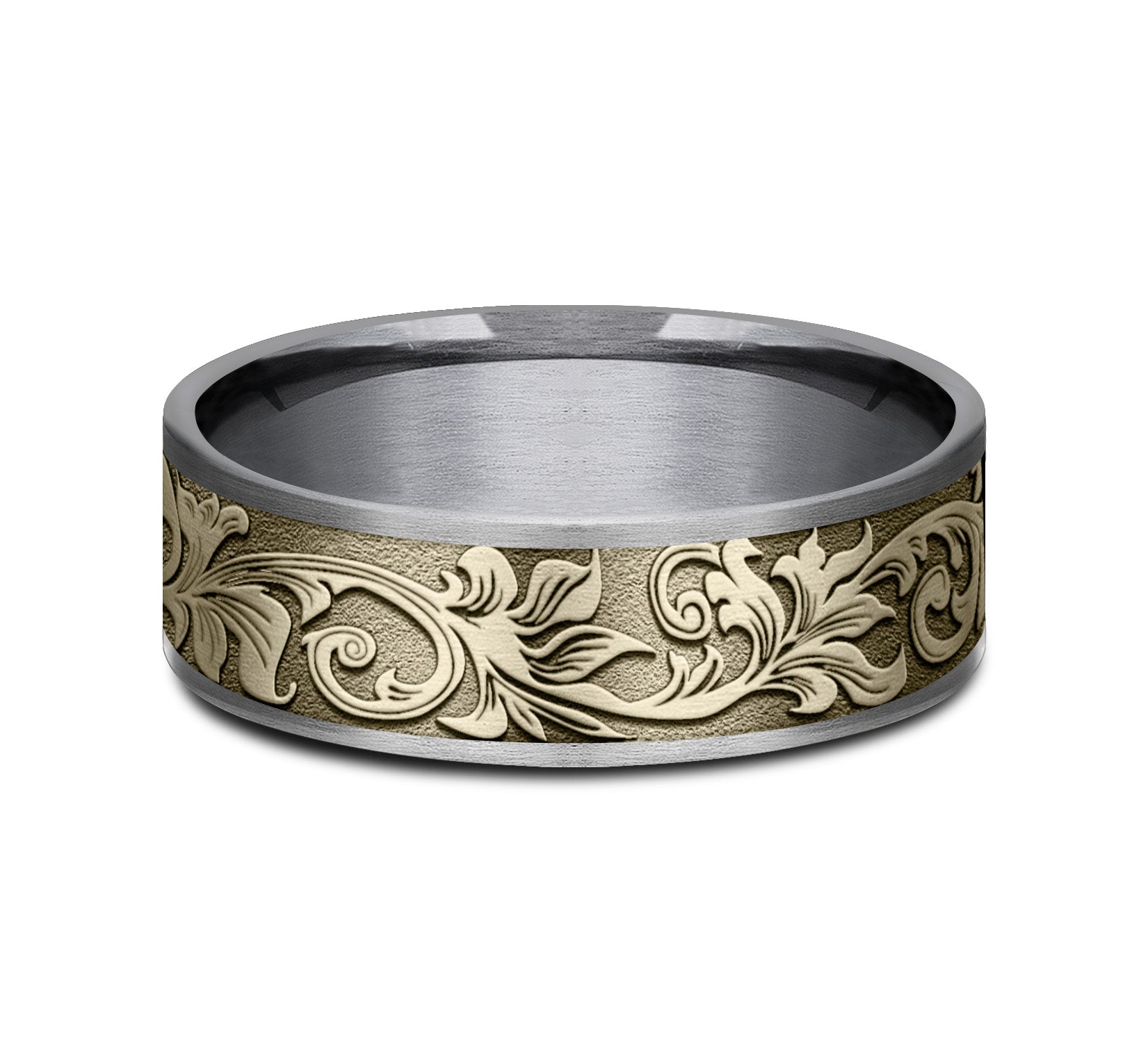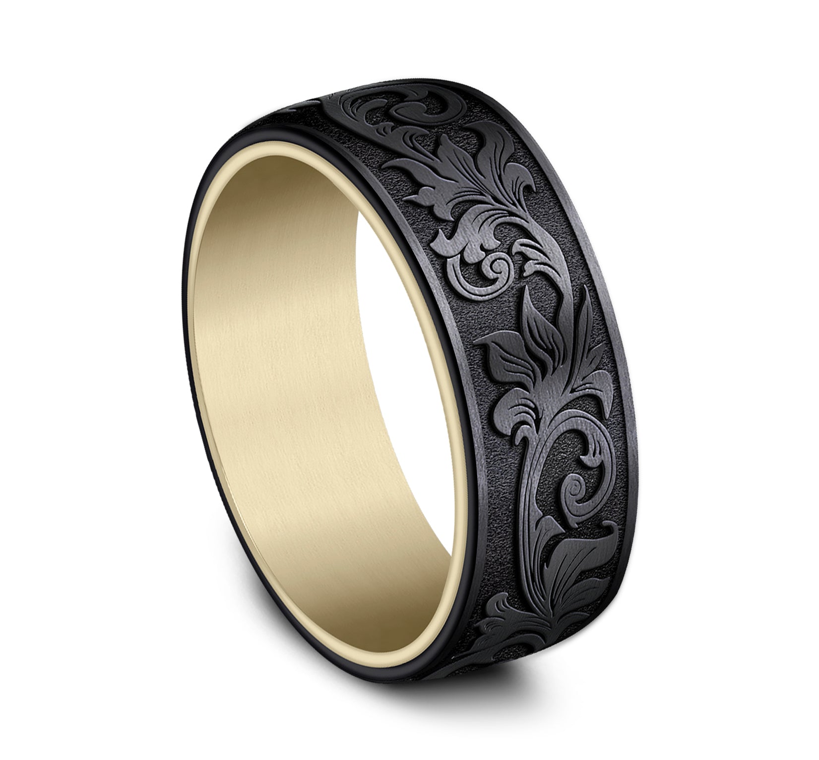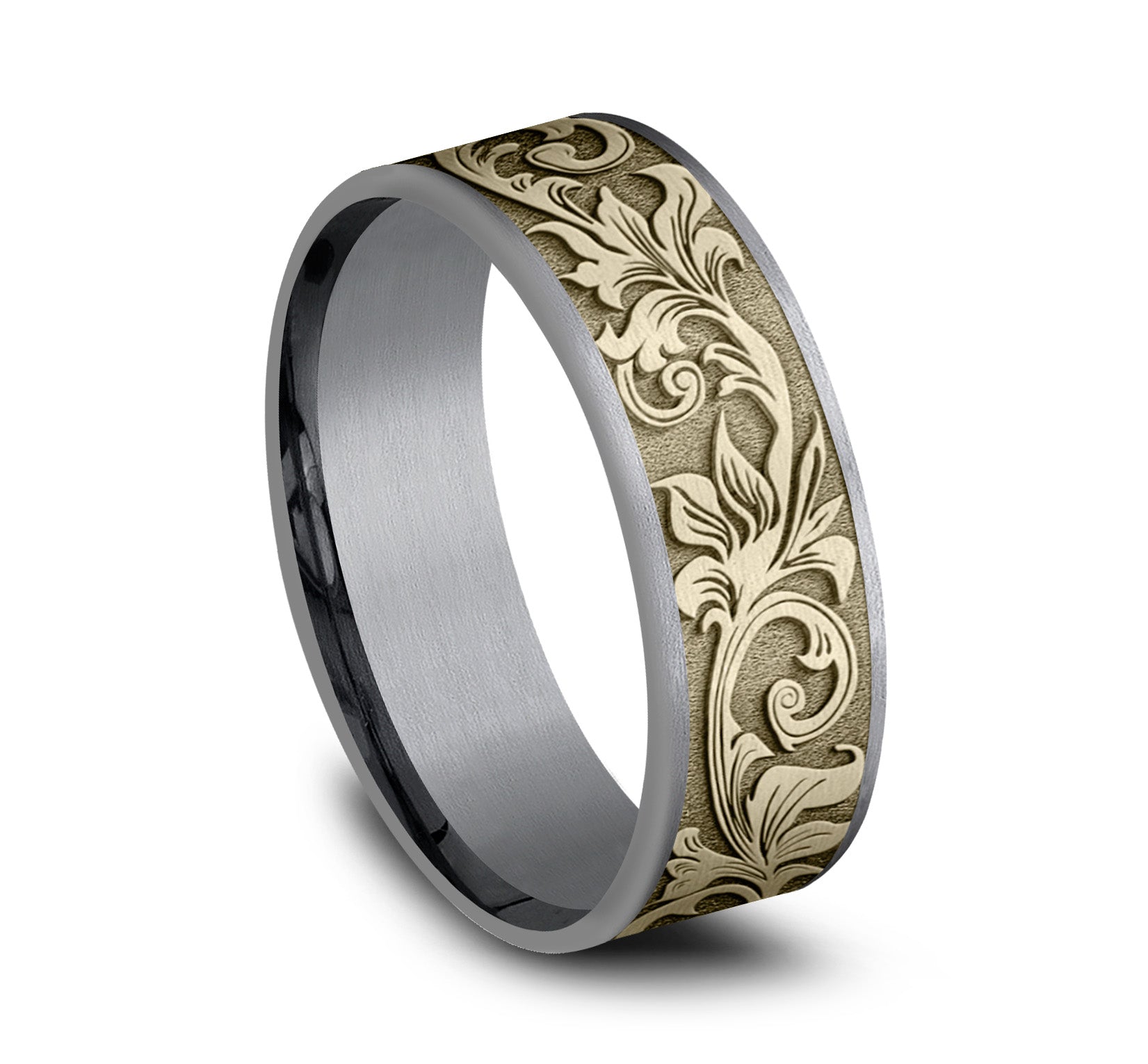 7.5mm, Comfort fit 14K Yellow Gold and Grey/Black Titanium Vintage script pattern, thin edges
