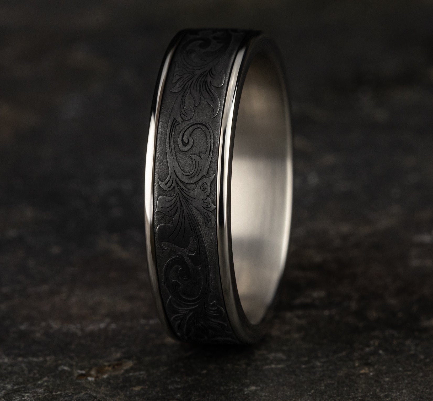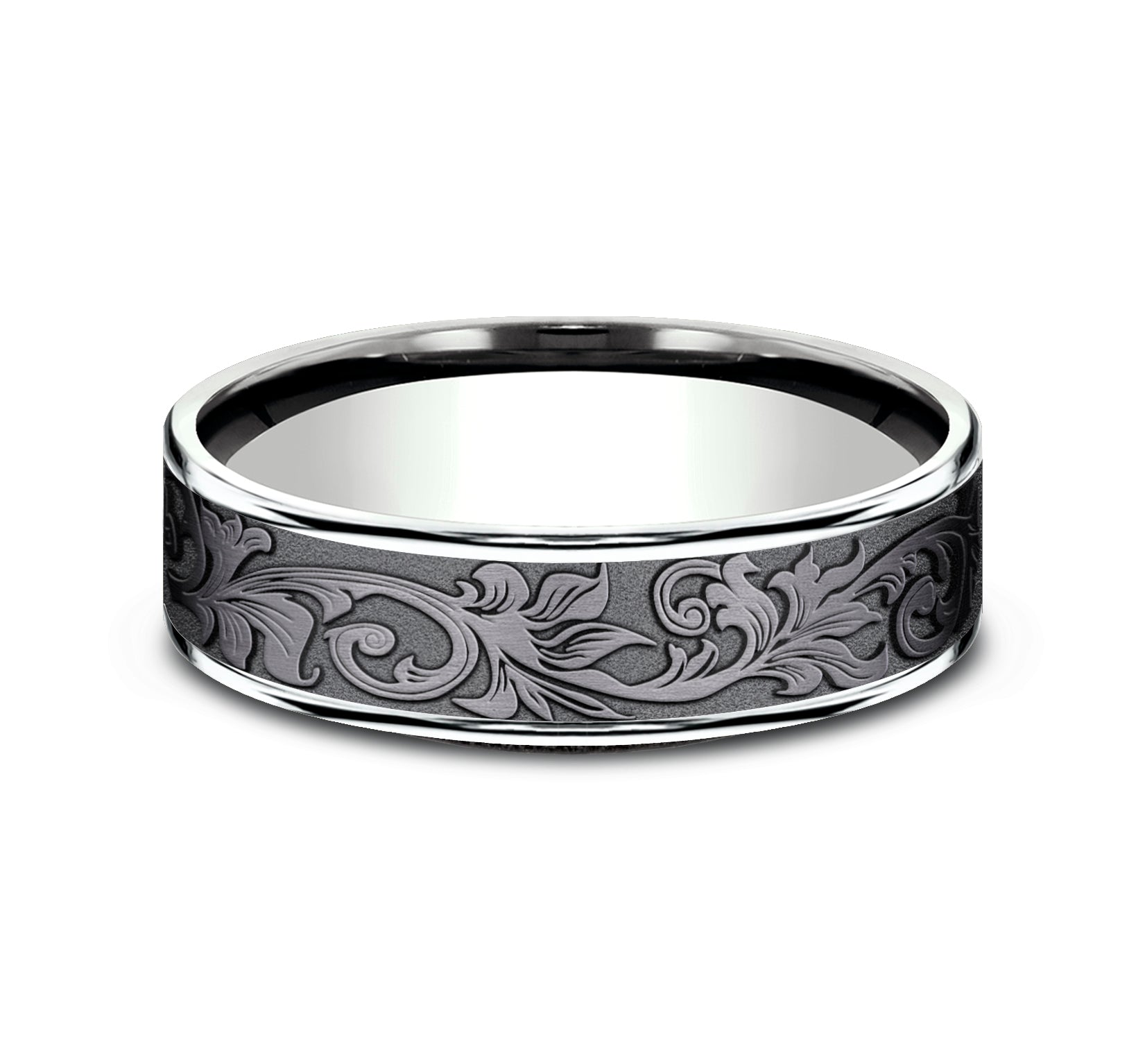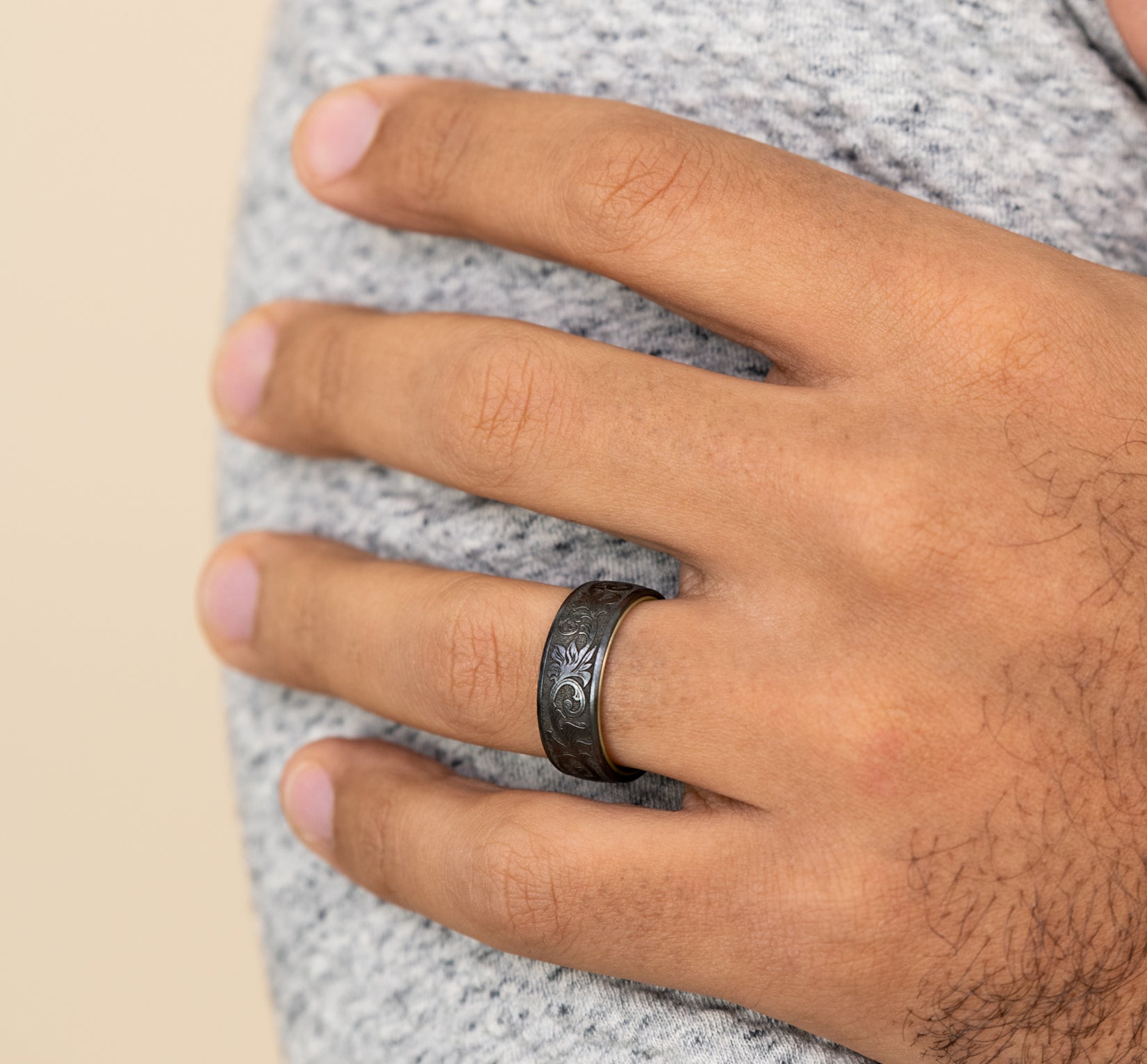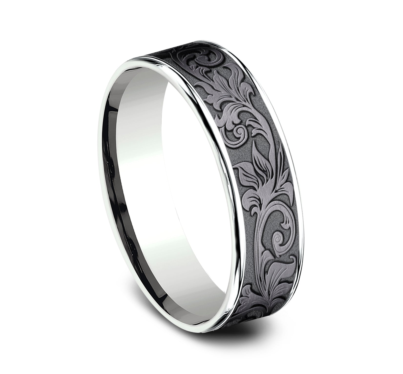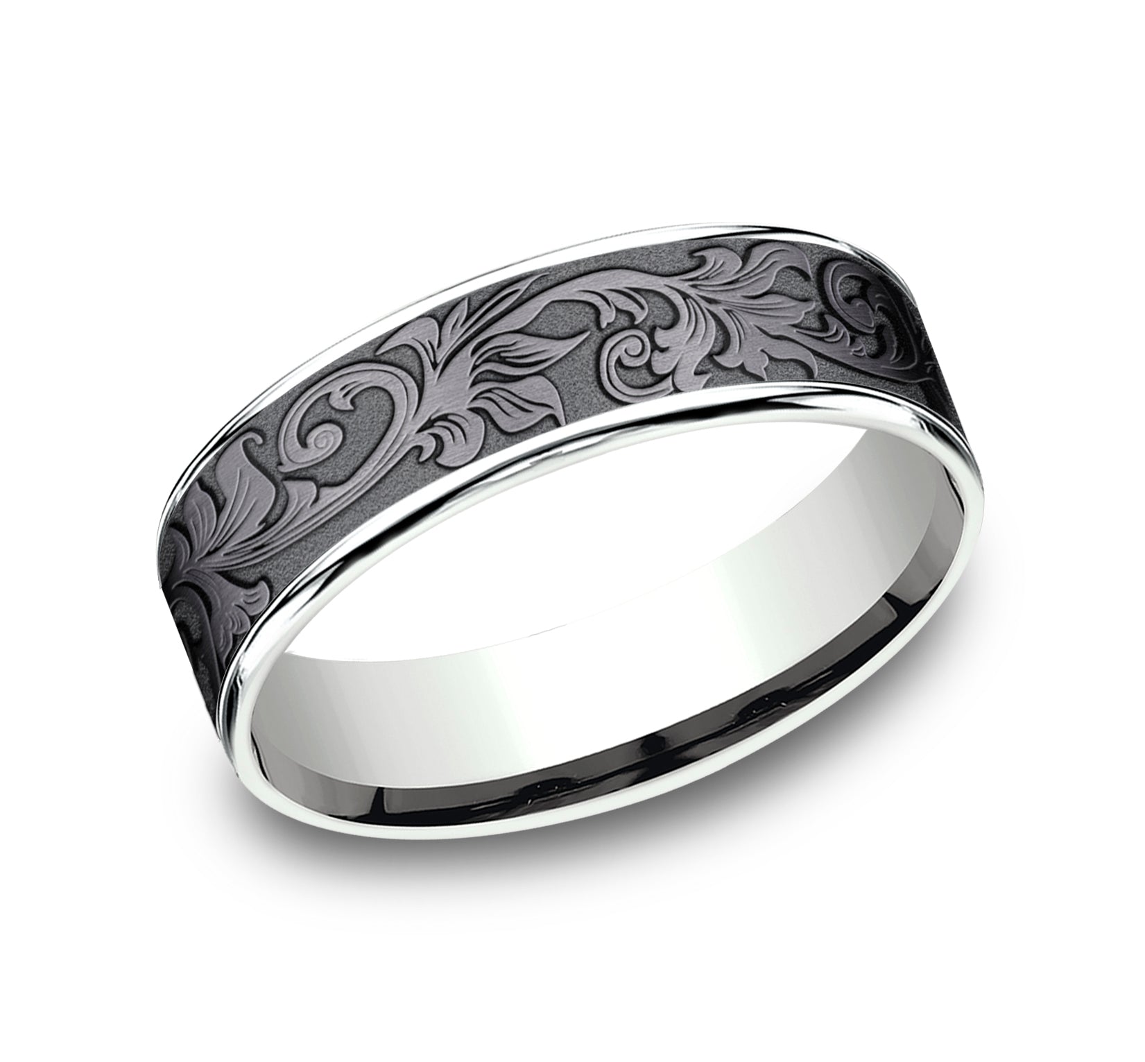 7.5mm, Comfort fit 14K Yellow Gold and Grey/Black Titanium Vintage script pattern, thin edges
