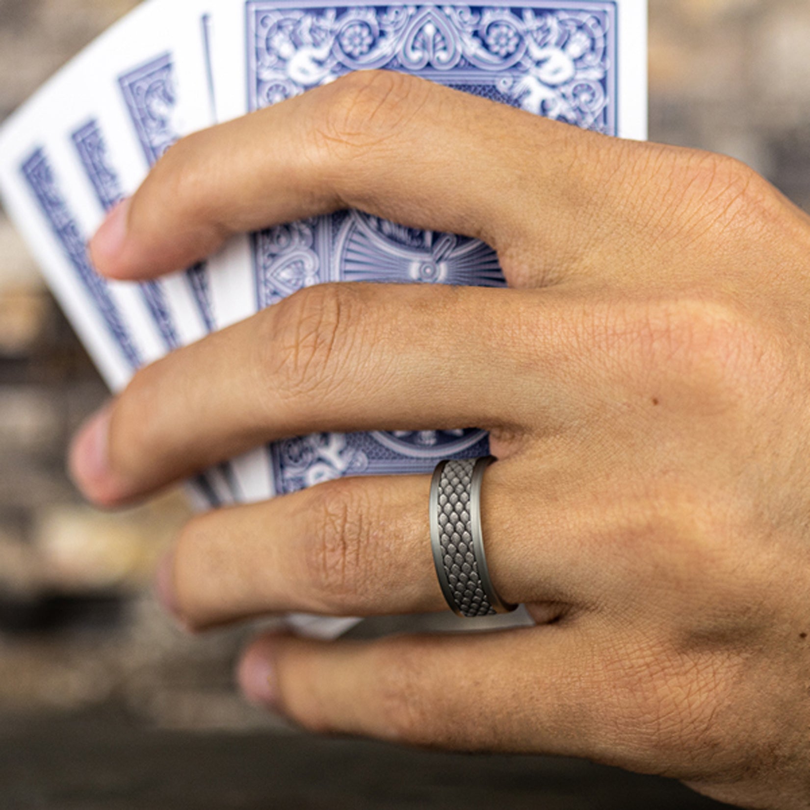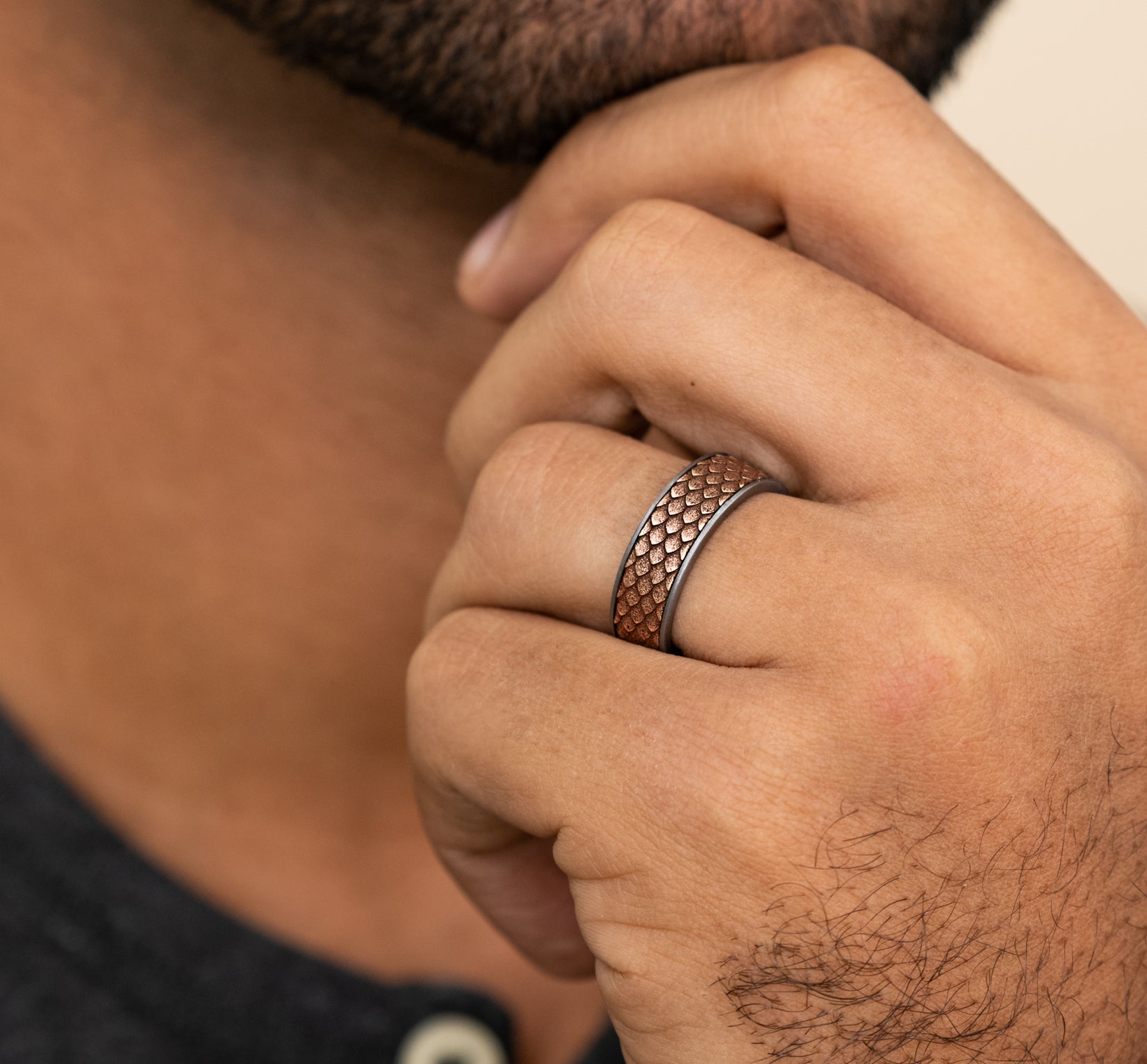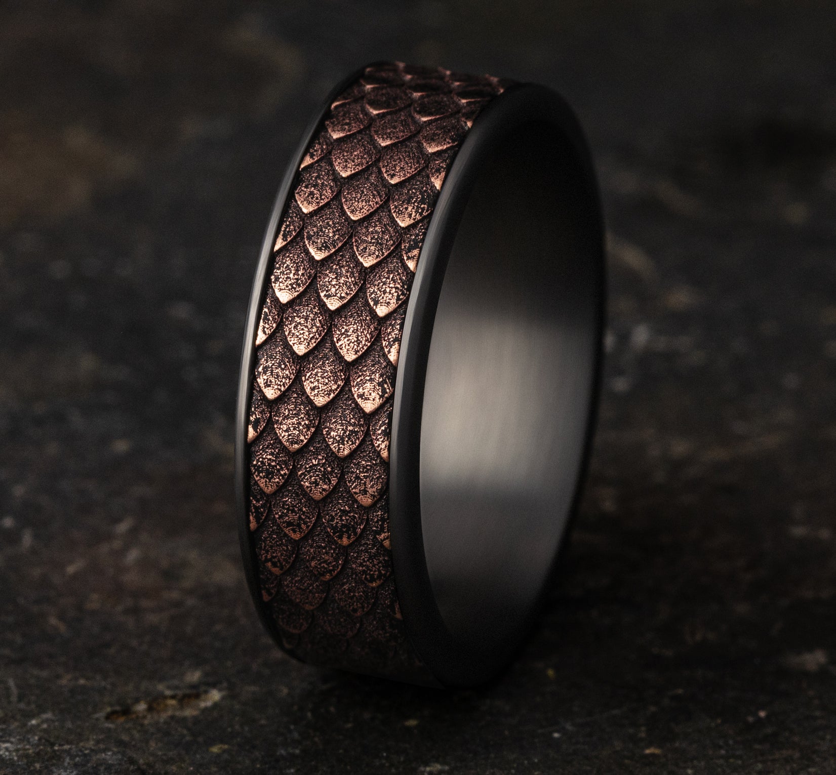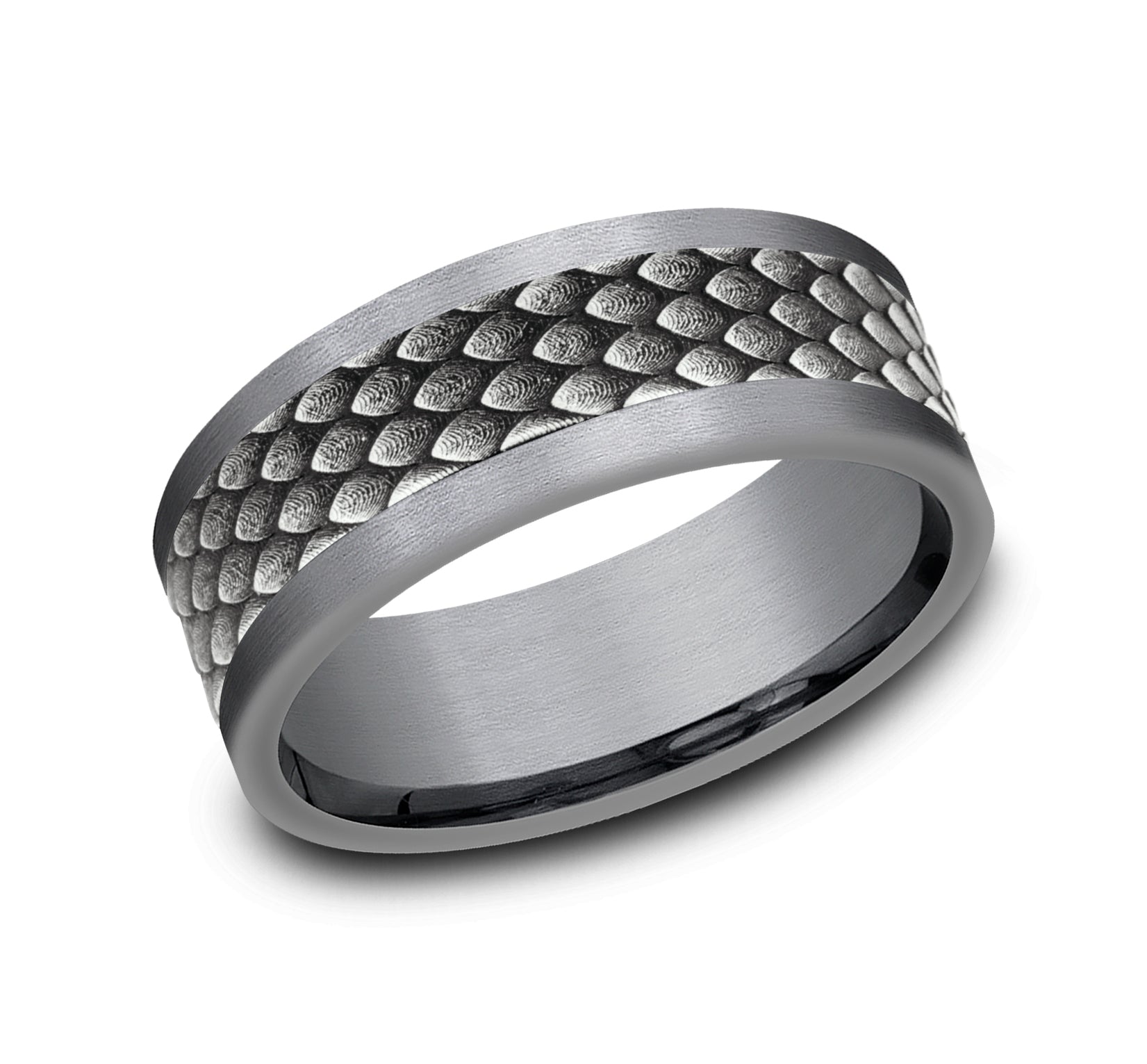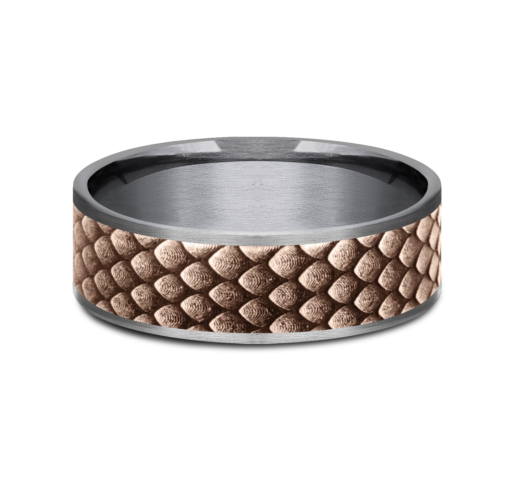 8mm, Comfort fit Grey Tantalum and 14K White Gold Dragon scale patterned center, straight edges