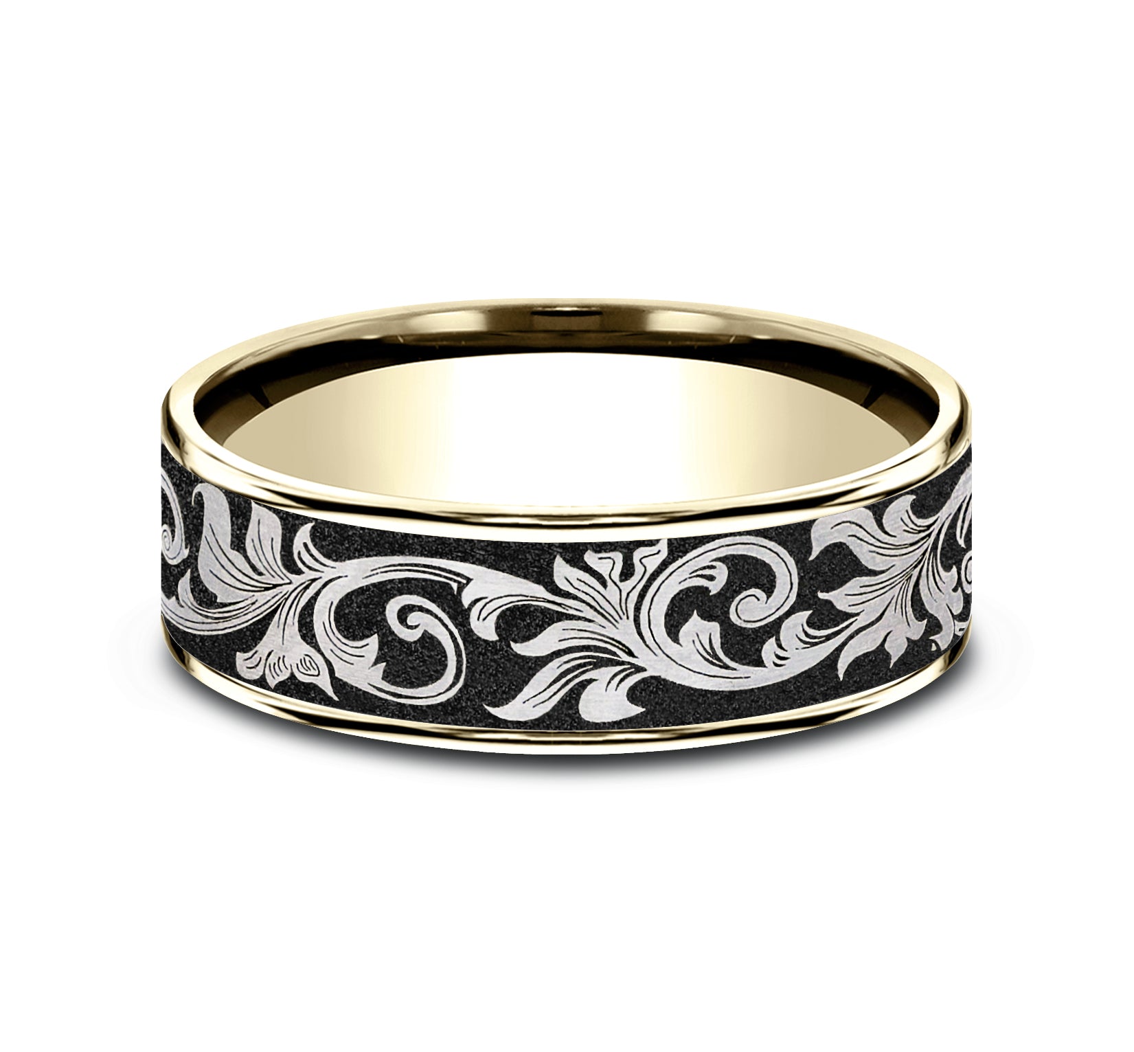 8mm, Comfort fit 14K White Gold and Grey Tantalum Vintage script pattern, polished drop bevel edges