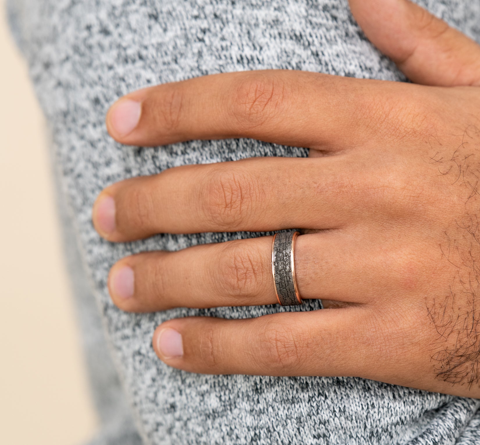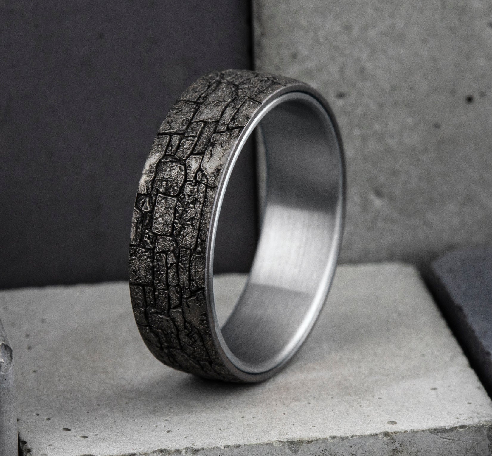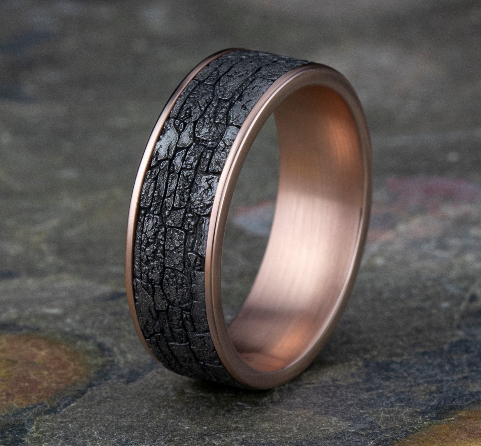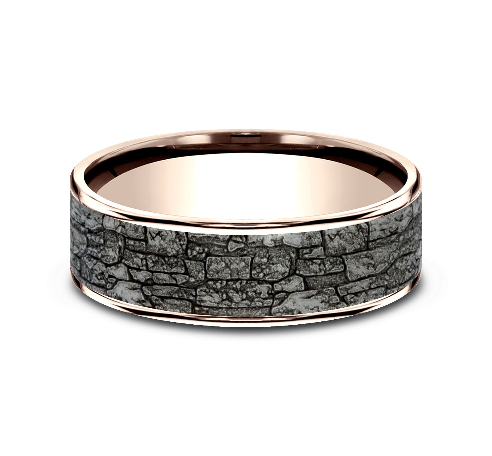 6.5mm, Comfort fit 14K White Gold and Grey Tantalum Stone wall pattern