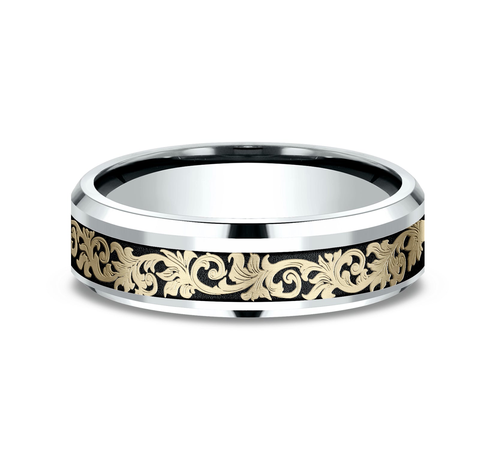 6mm, Comfort fit 14K White and Yellow Gold Vintage script pattern with wear resistant black detailing, polished bevel edges