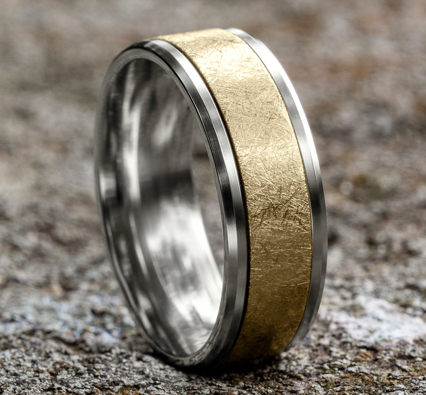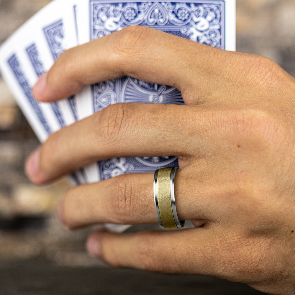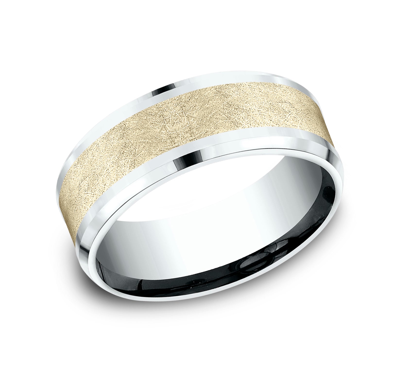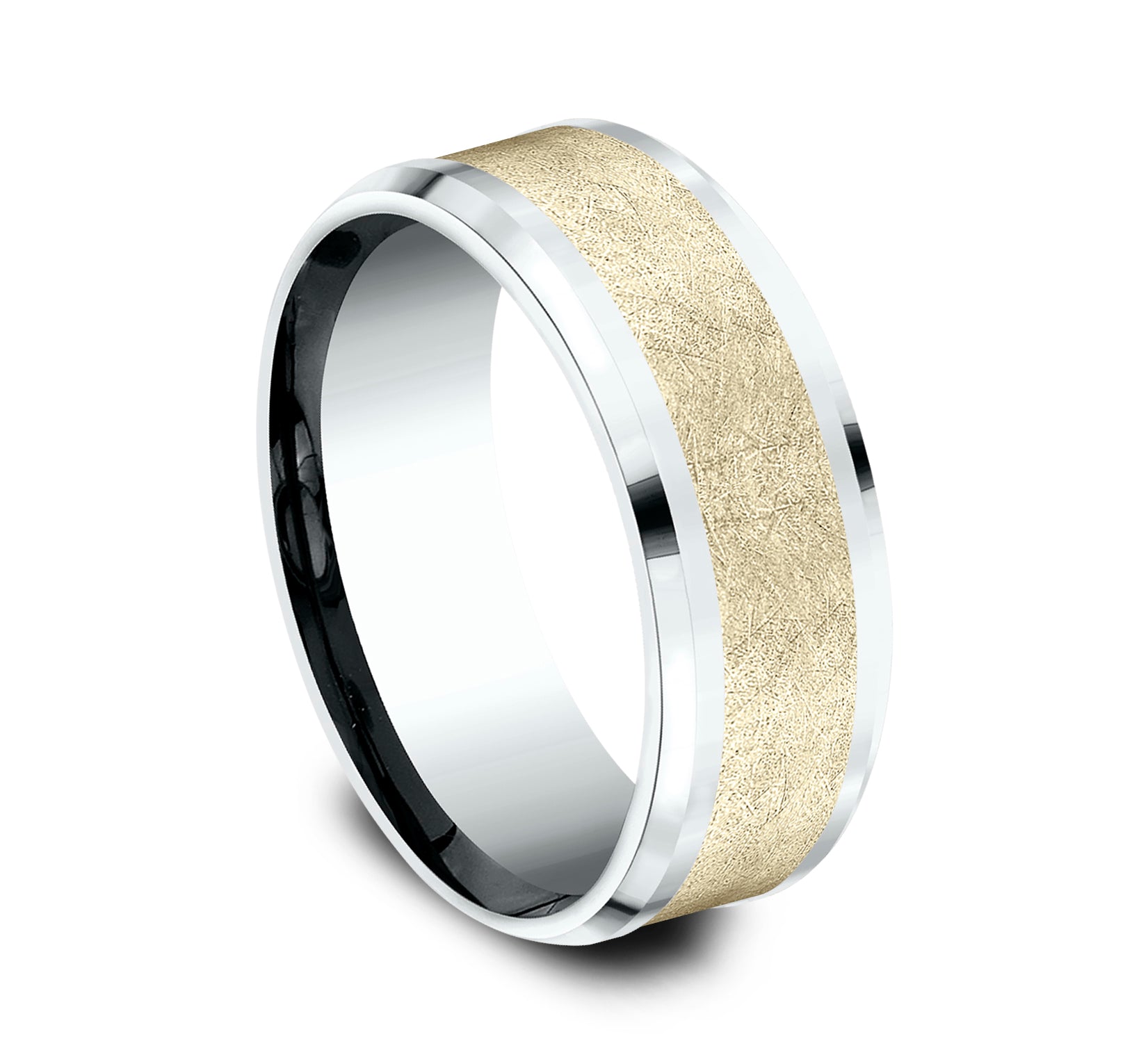 8mm, Comfort fit 14K White and Yellow Gold Swirl center, polished drop bevel edges