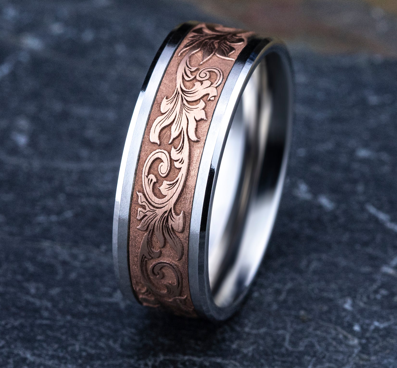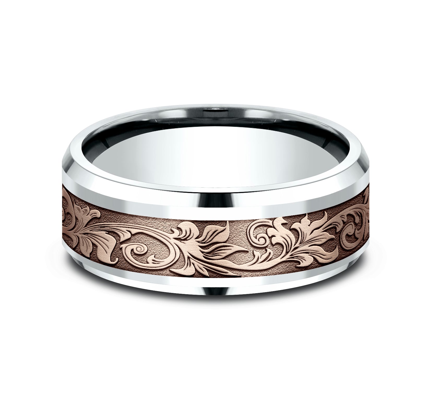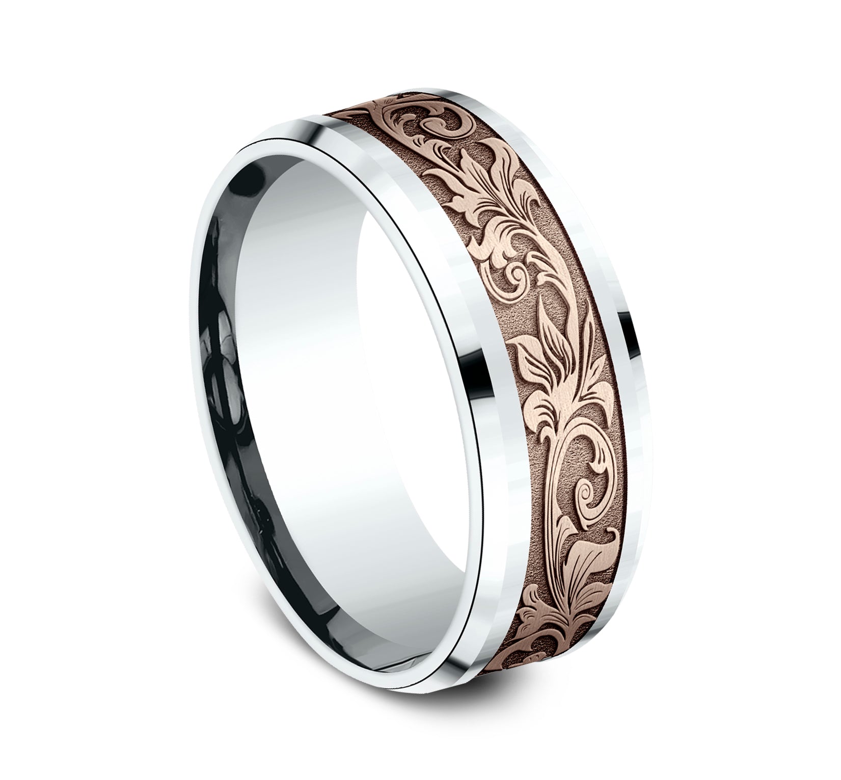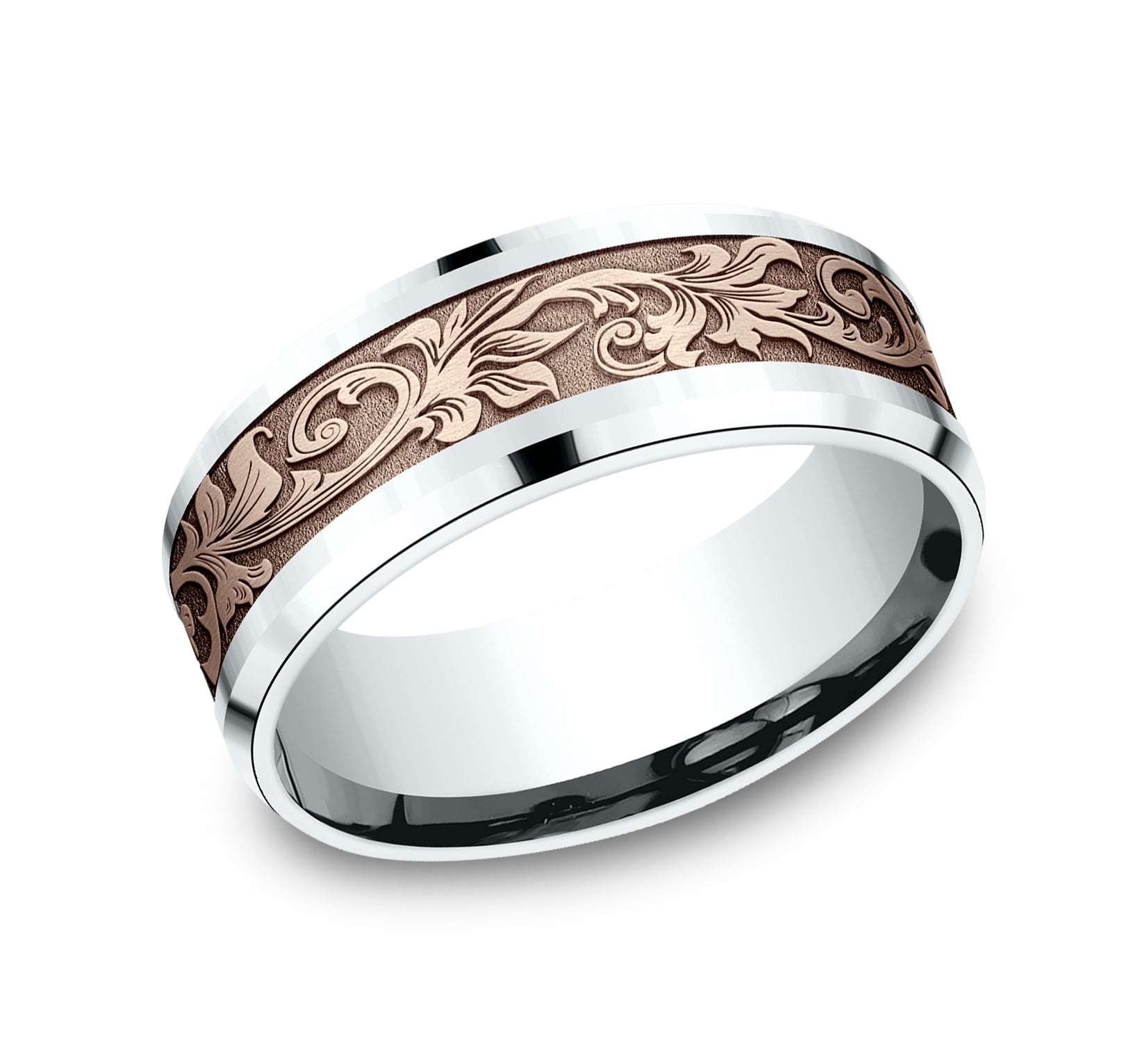 7mm, Lightweight comfort fit 14K White and Yellow Gold Vintage script pattern, polished bevel edges