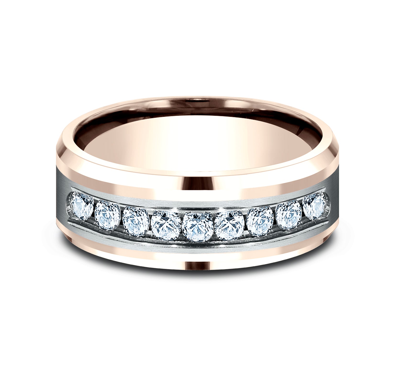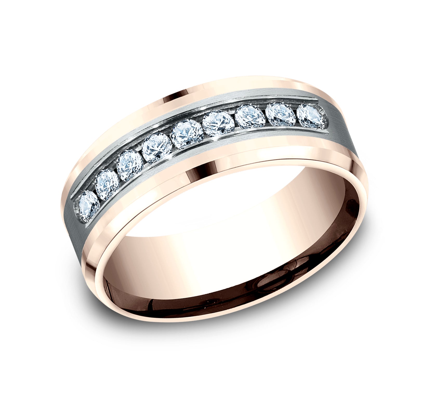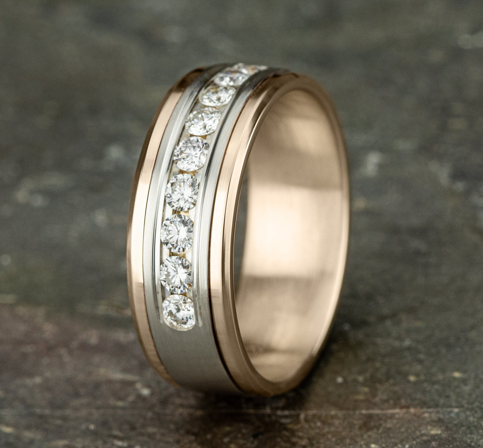 8mm, Comfort fit 14K Rose and White Gold Satin center, polished bevel edges 9 channel set diamonds Carat weight is .72ct Clarity SI1-2, Color GH