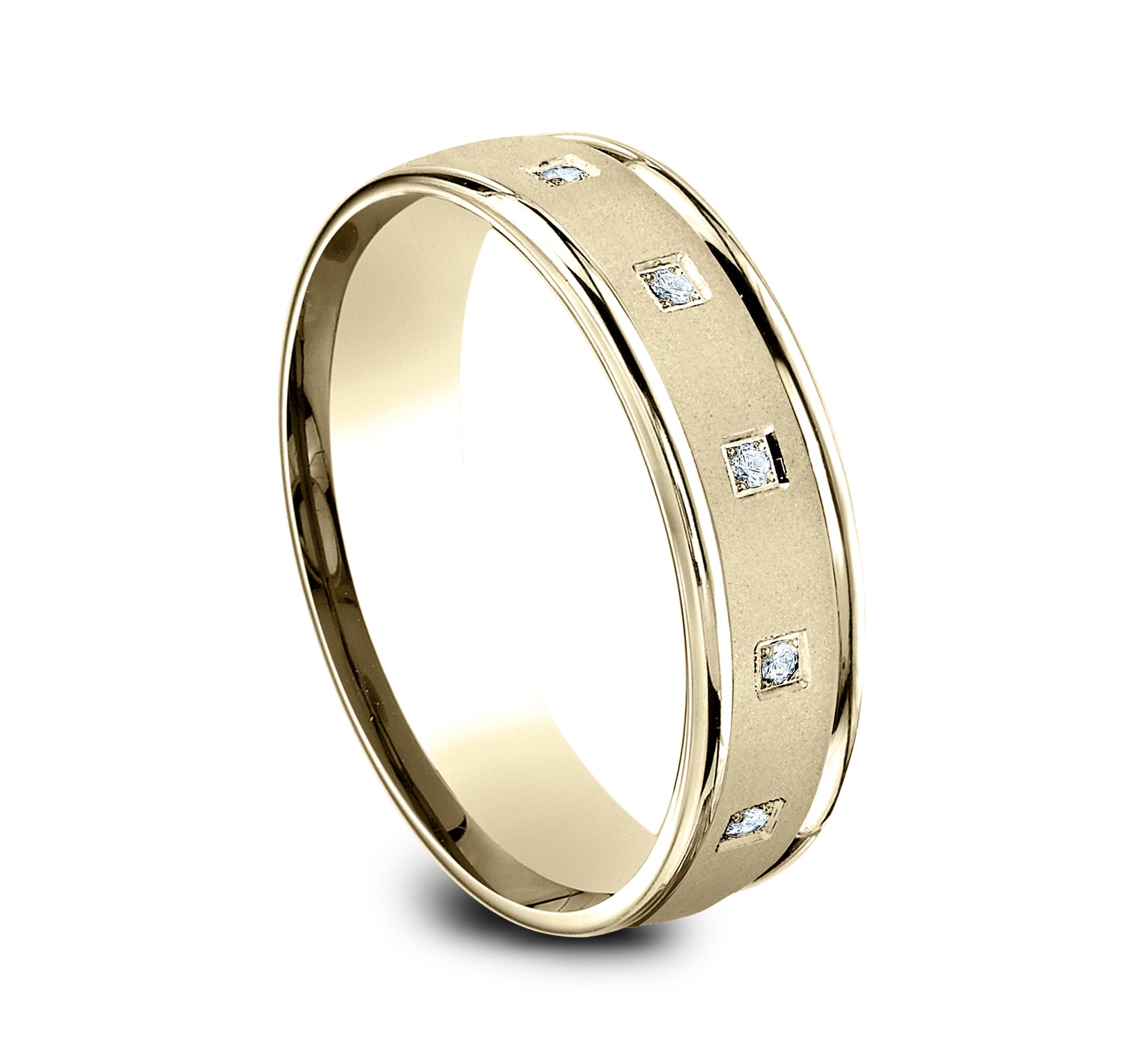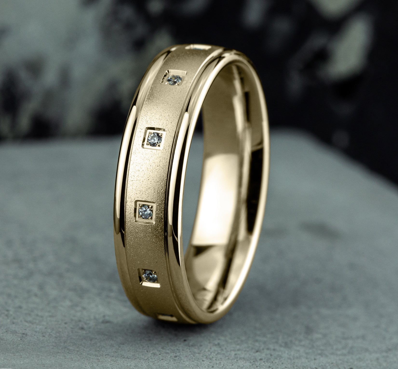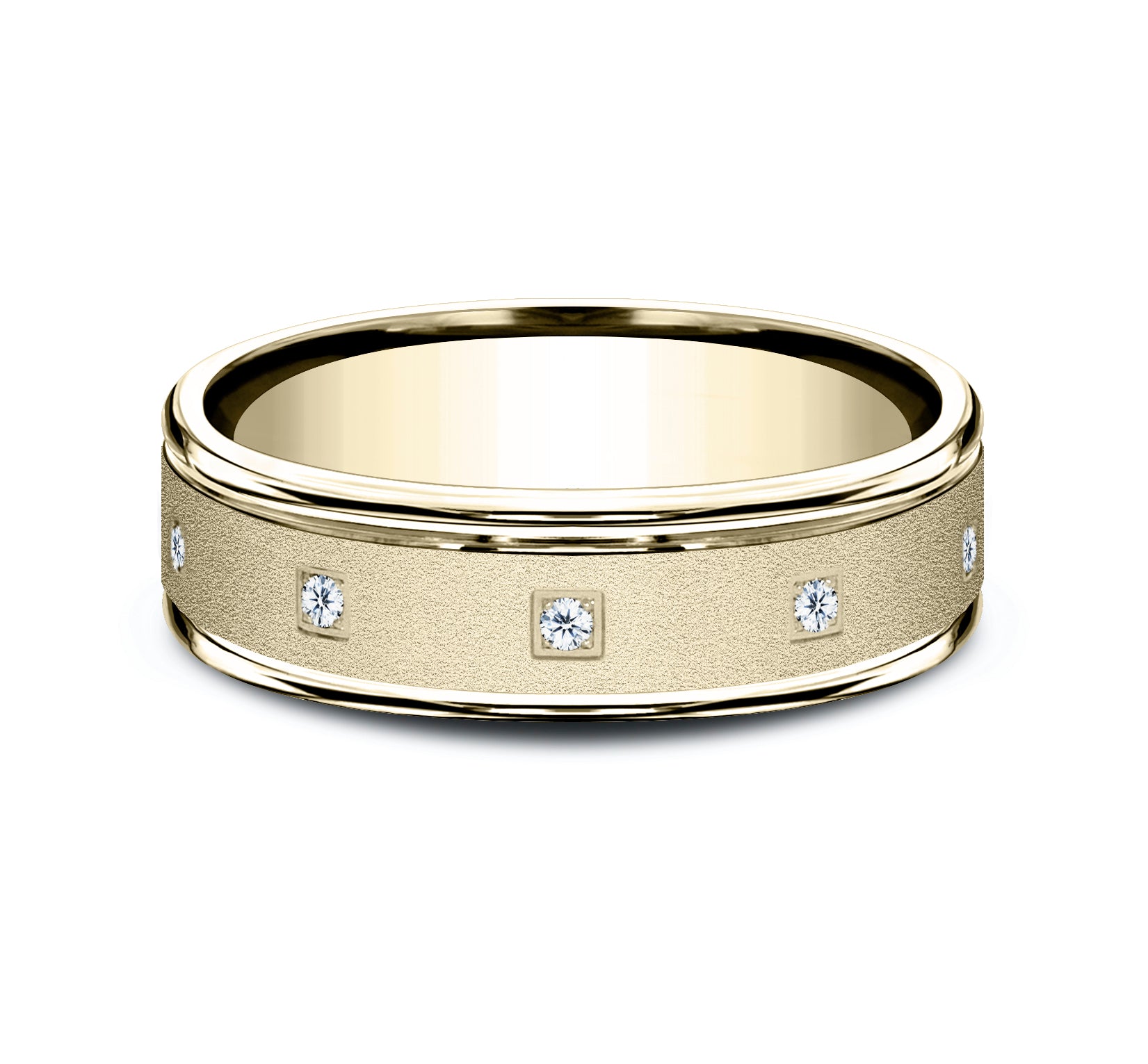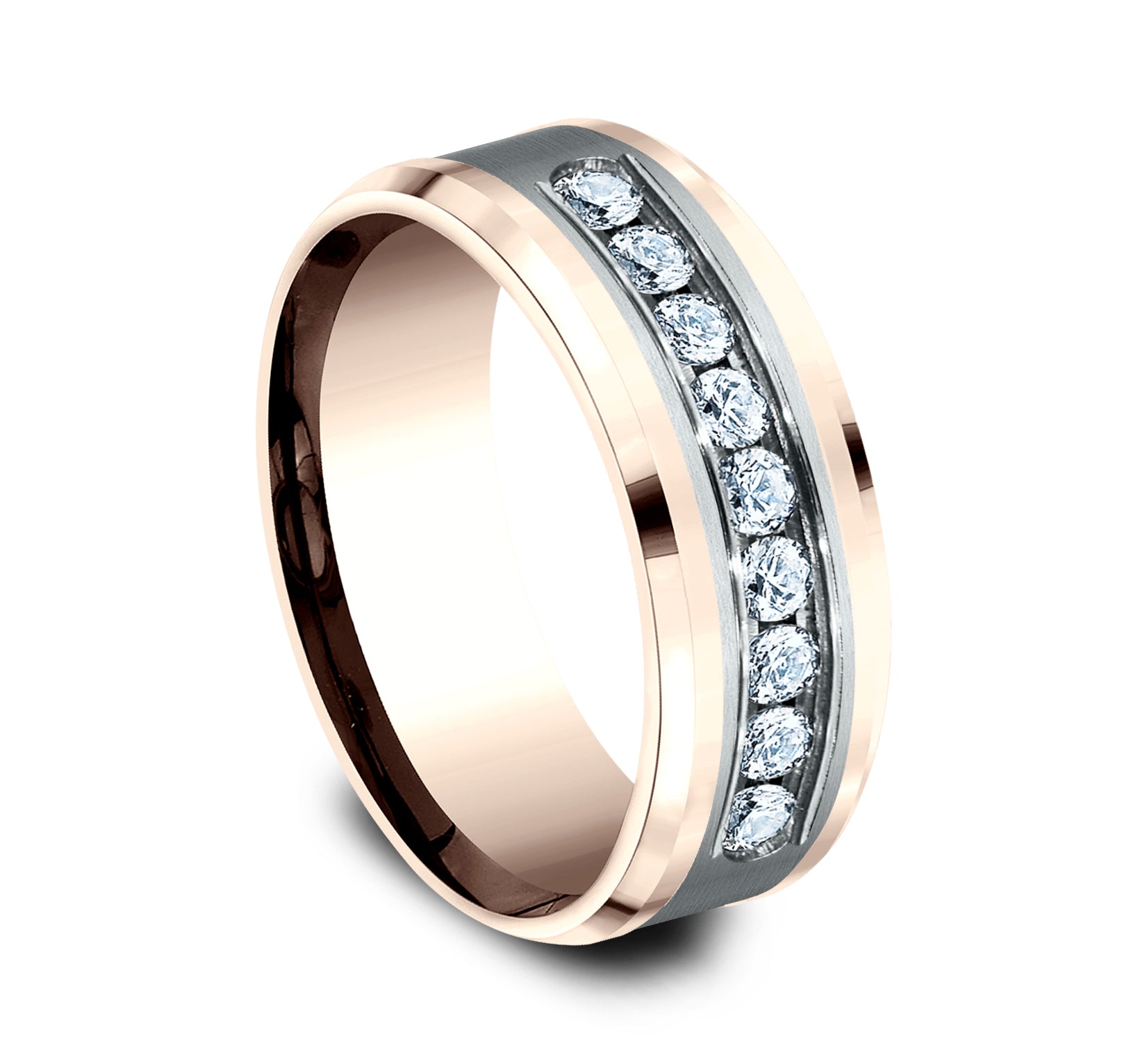 8mm, Comfort fit 14K Rose and White Gold Satin center, polished bevel edges 9 channel set diamonds Carat weight is .72ct Clarity SI1-2, Color GH