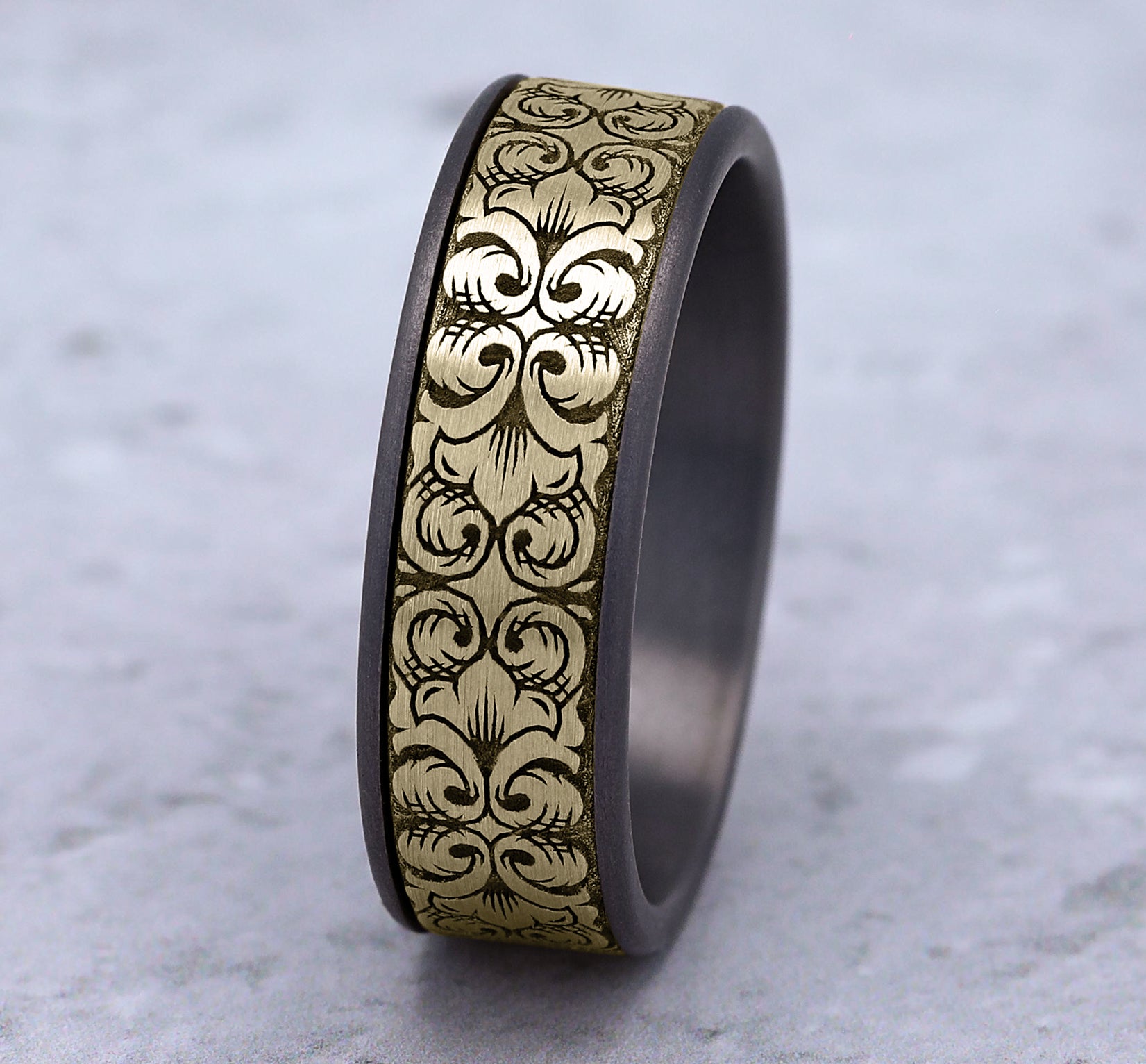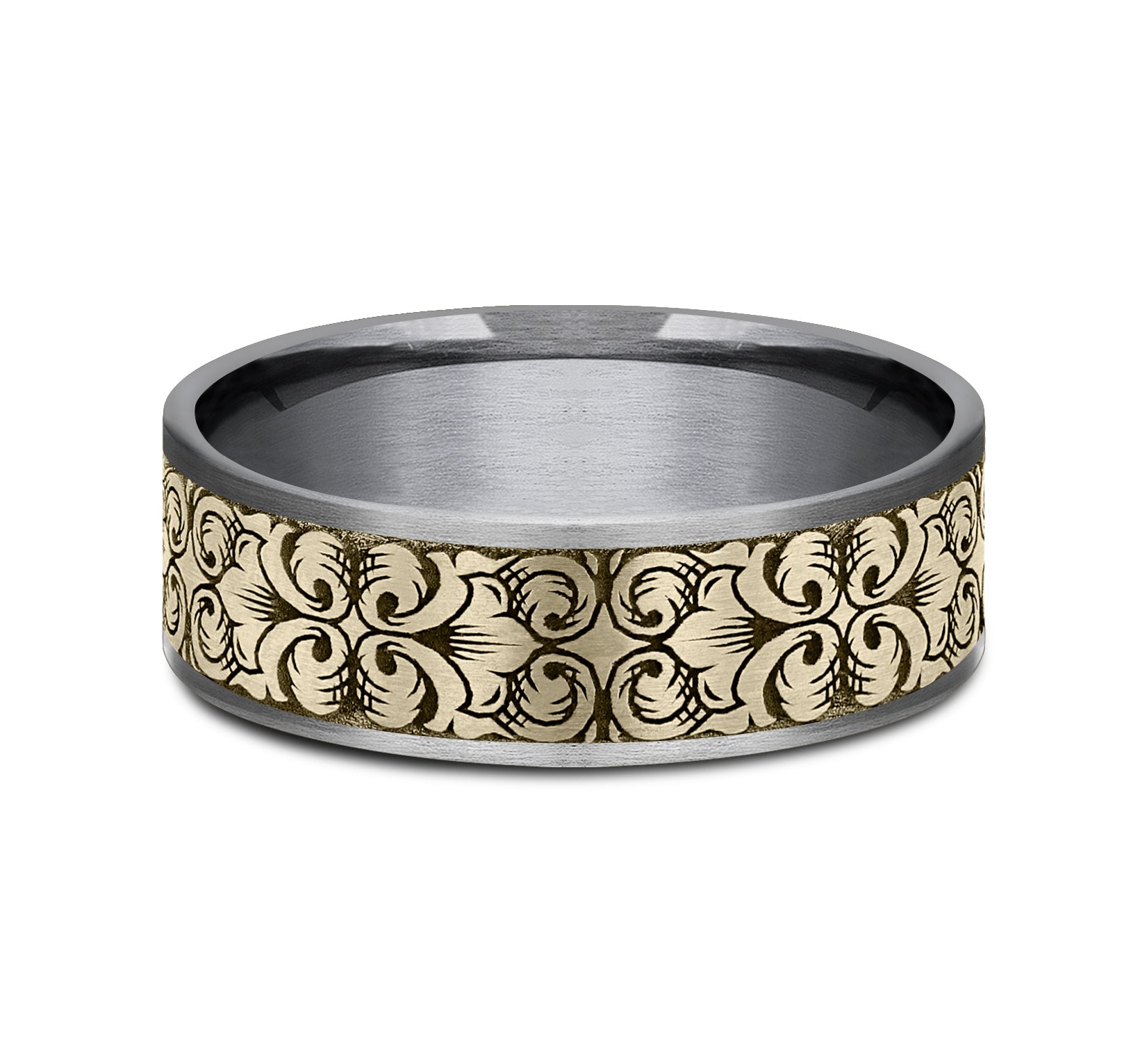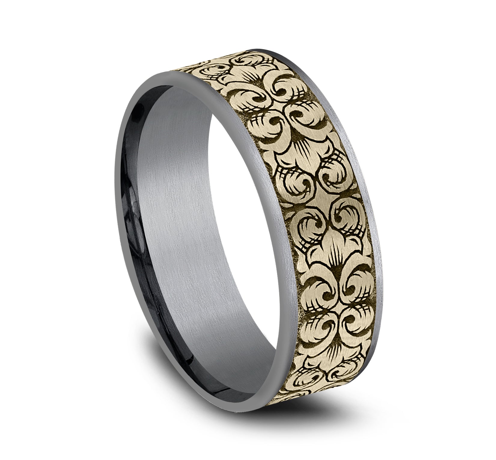 7.5mm, Comfort fit Grey Tantalum and 14K Yellow Gold Border script pattern, thin edges
