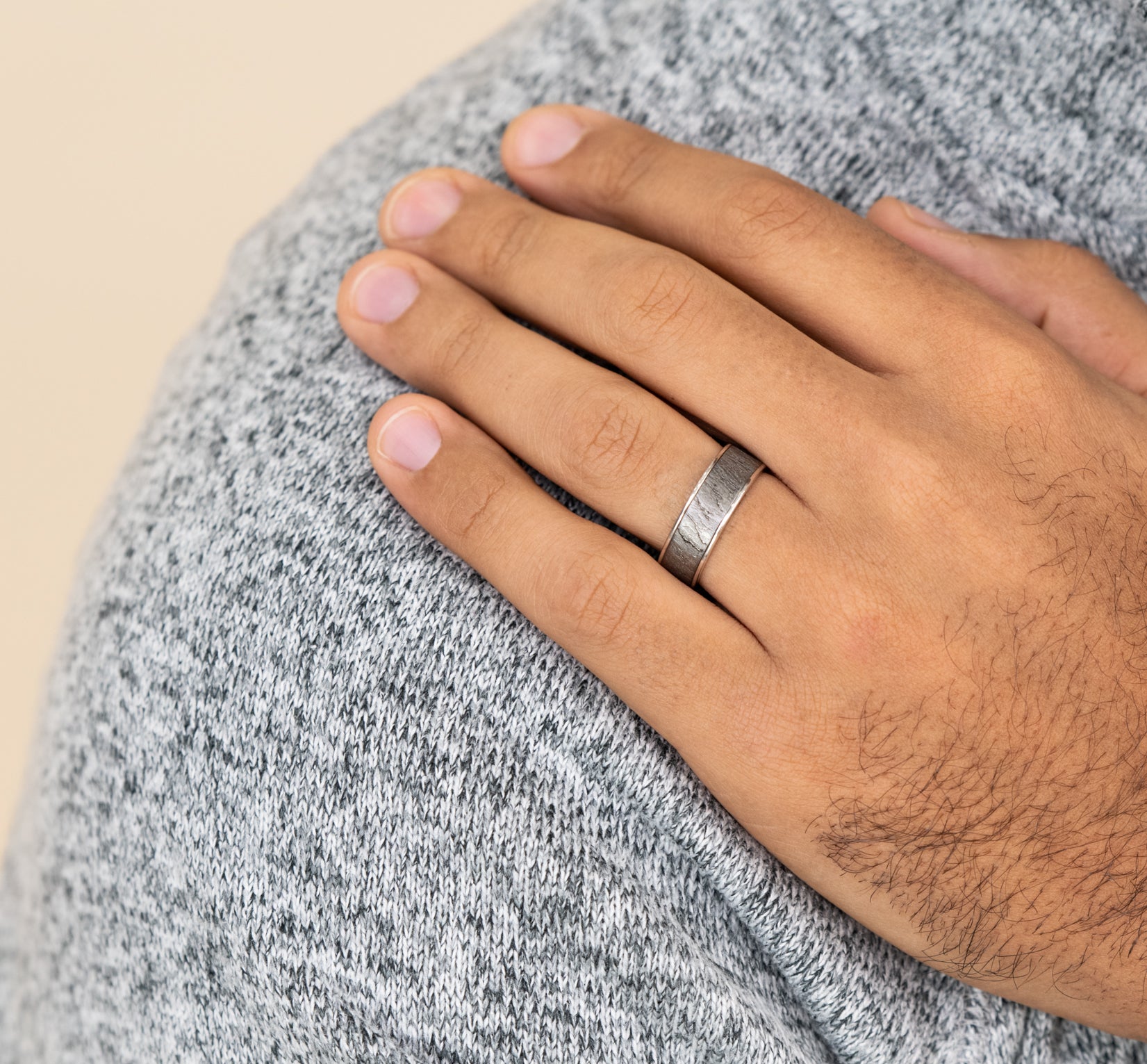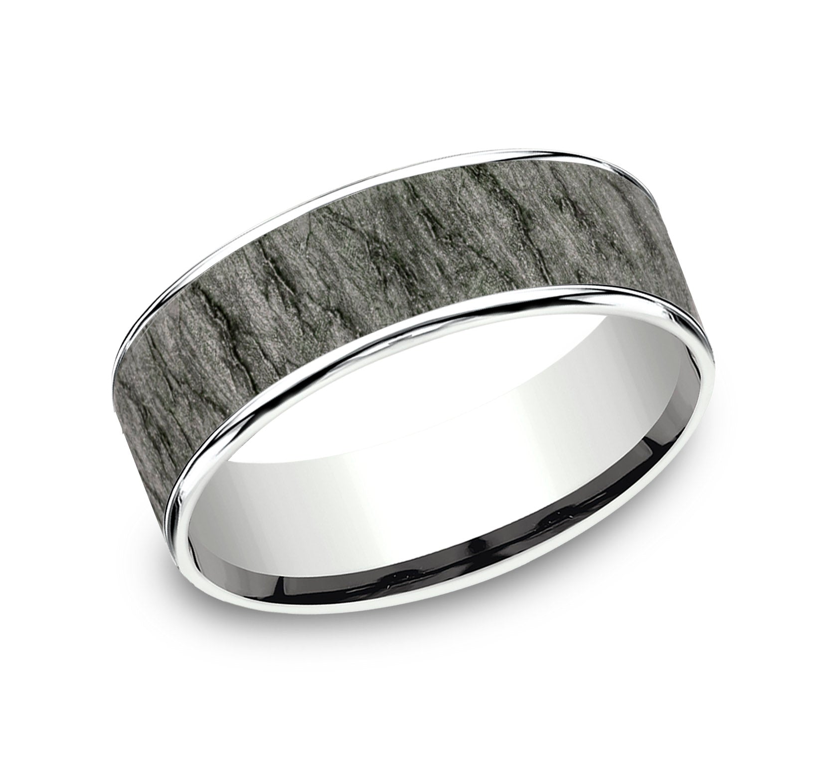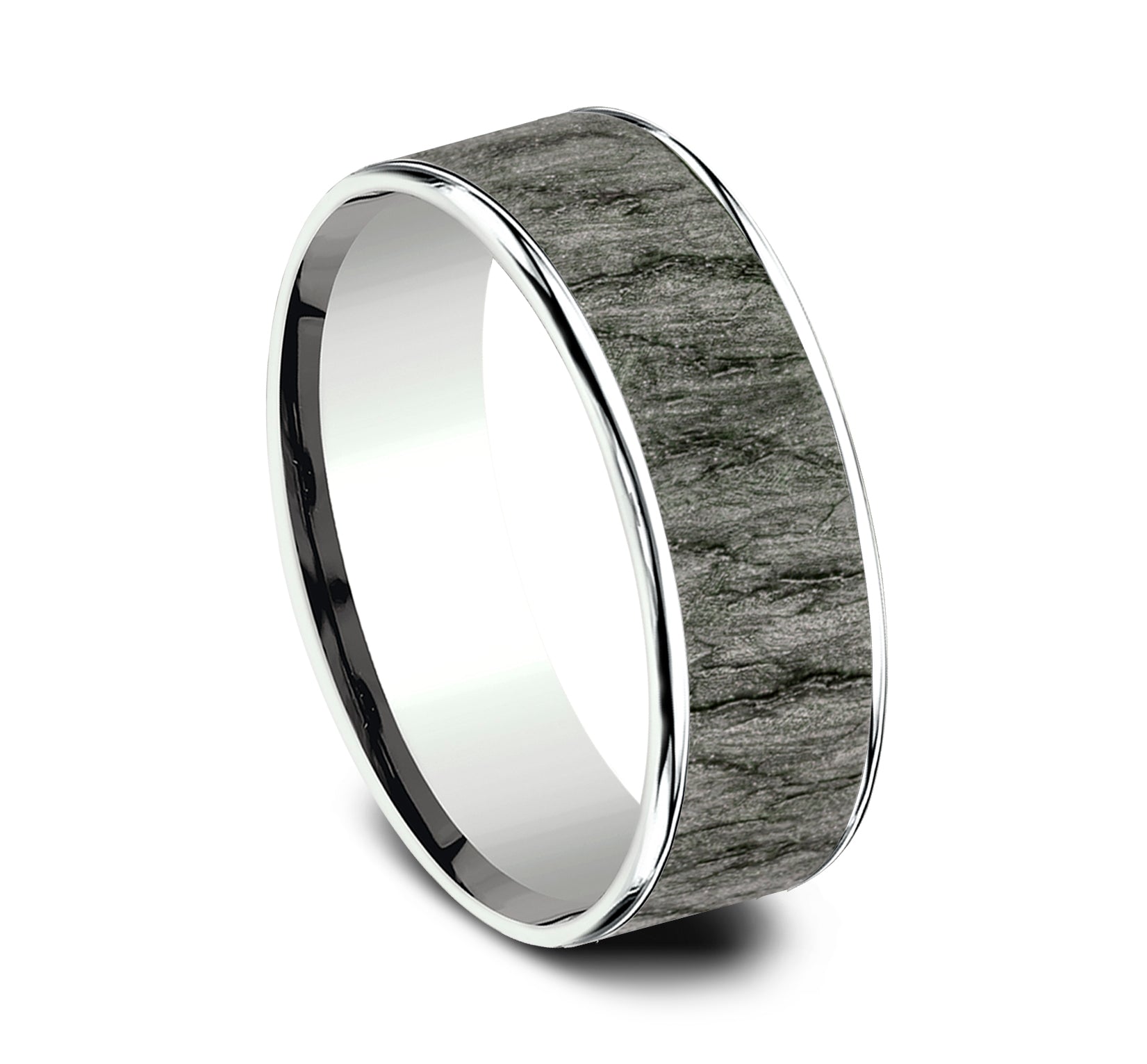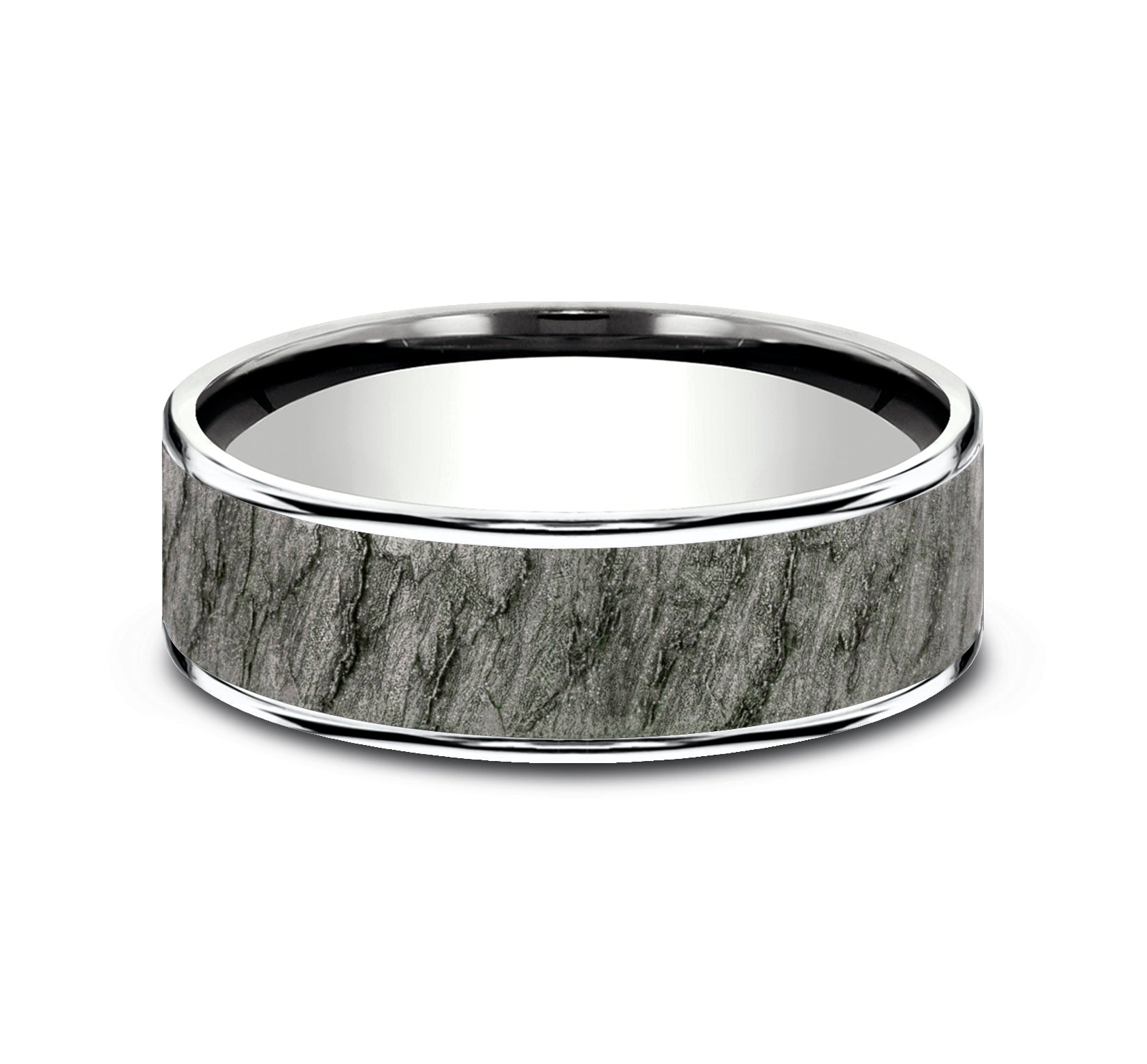 7.5mm, Comfort fit 14K White Gold and Grey Tantalum Lava rock textured center, polished thin edges