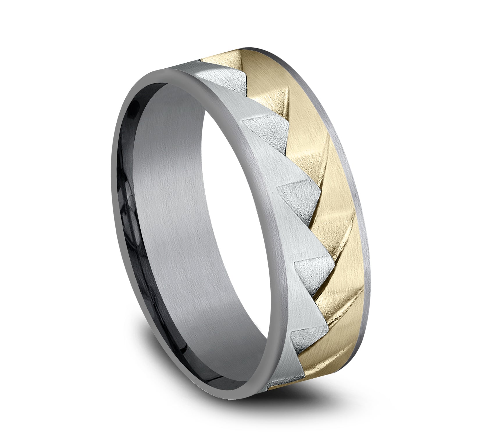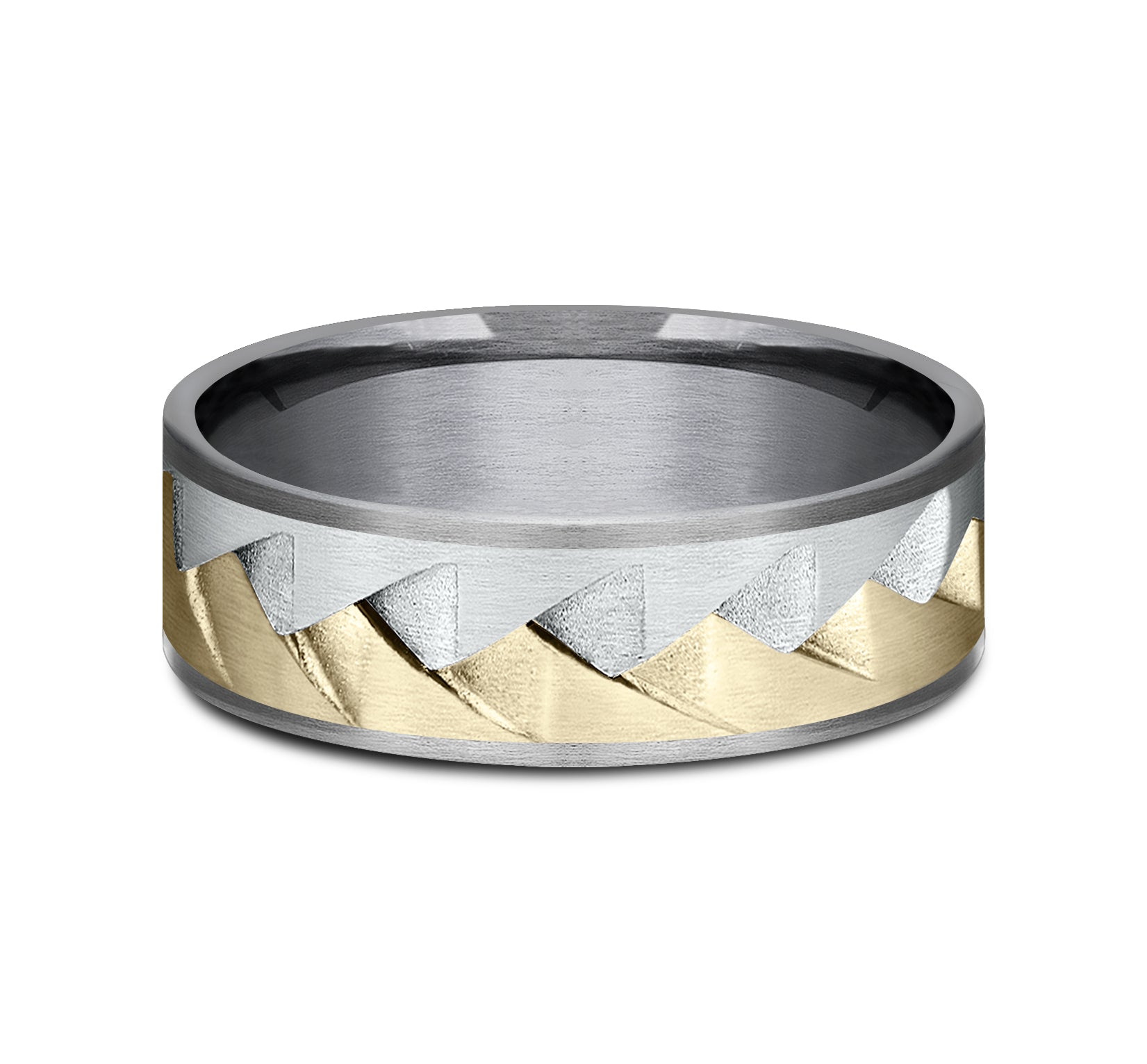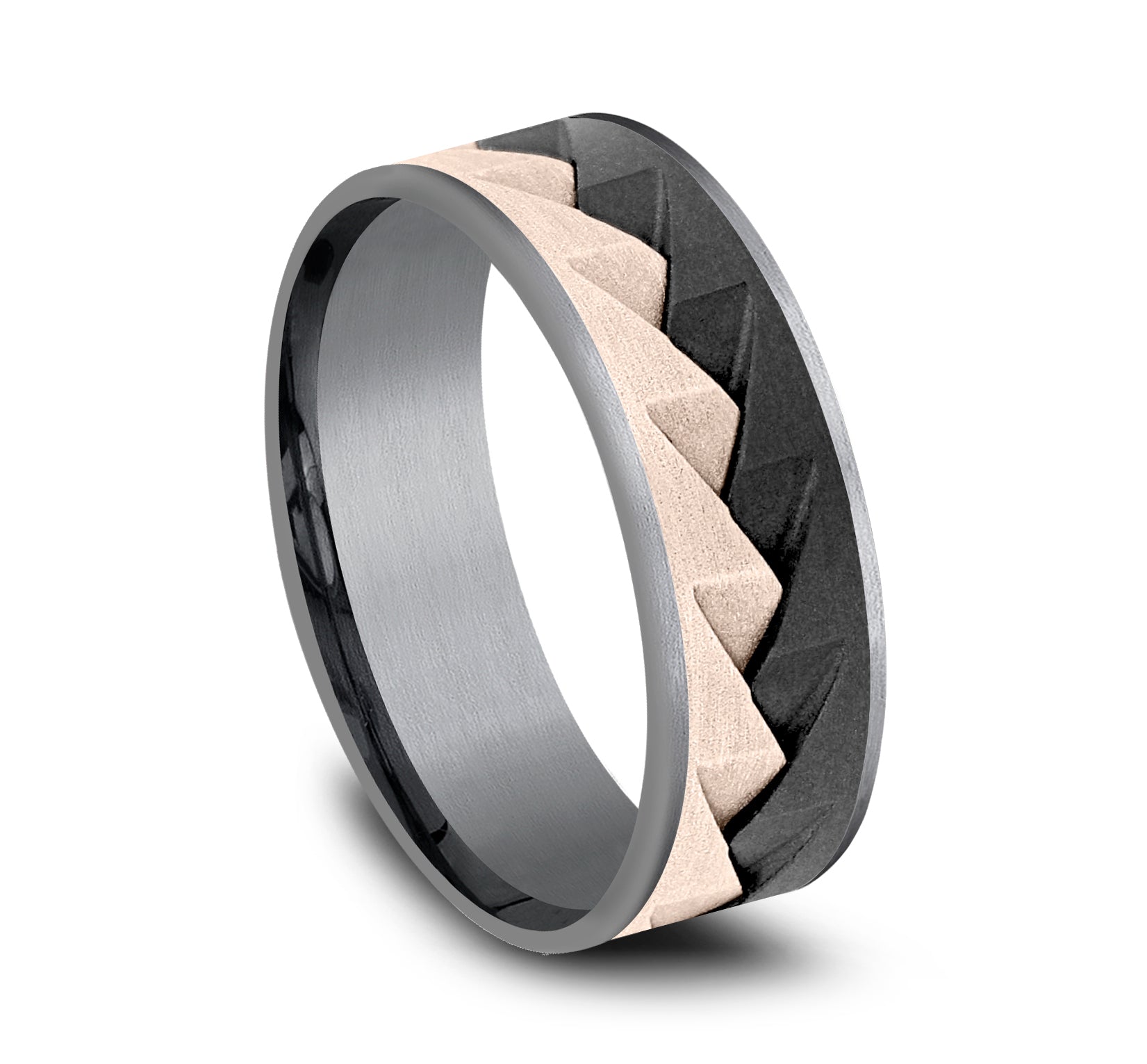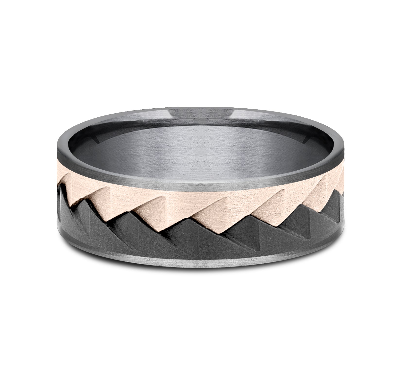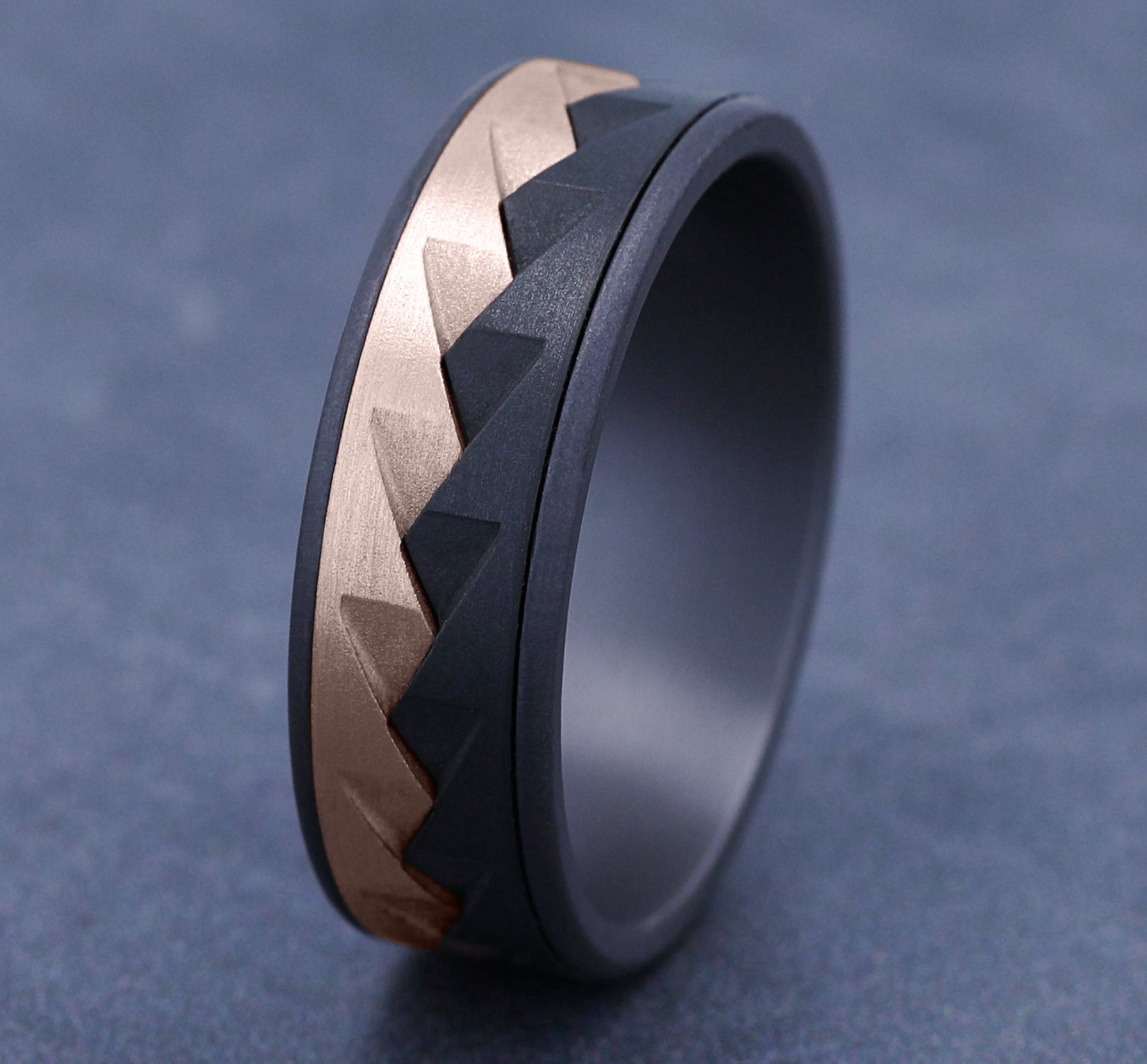 7.5mm, Comfort fit Grey Tantalum, Black Titanium, and 14K Rose Gold Saw tooth pattern, thin edges